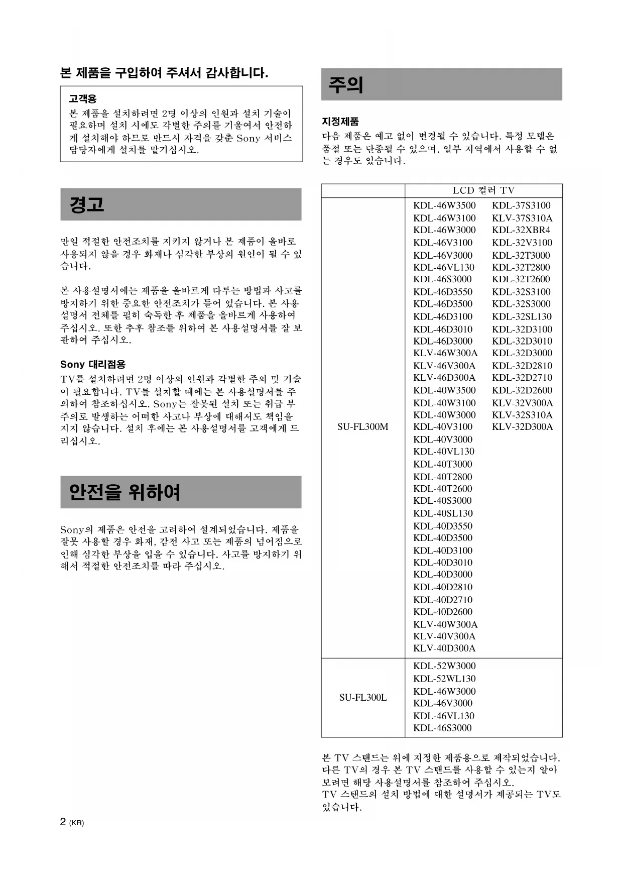 SU-FL300L KDL-52W3000 KDL-52WL130 KDL-46W3000 KDL-46V3000 KDL-46VL130 KDL-46S30003 (KR) 본 제품은 자격을 갖춘 Sony 서비스 담당 자에게만 설치를 맡기십시오. TV 및 TV 스탠드는 매우 무겁기 때문에 비자격자가 설치 할 경우 심각한 부상을 입을 수 있습니다. TV 스탠드가 넘어지지 않도록 안전장치를