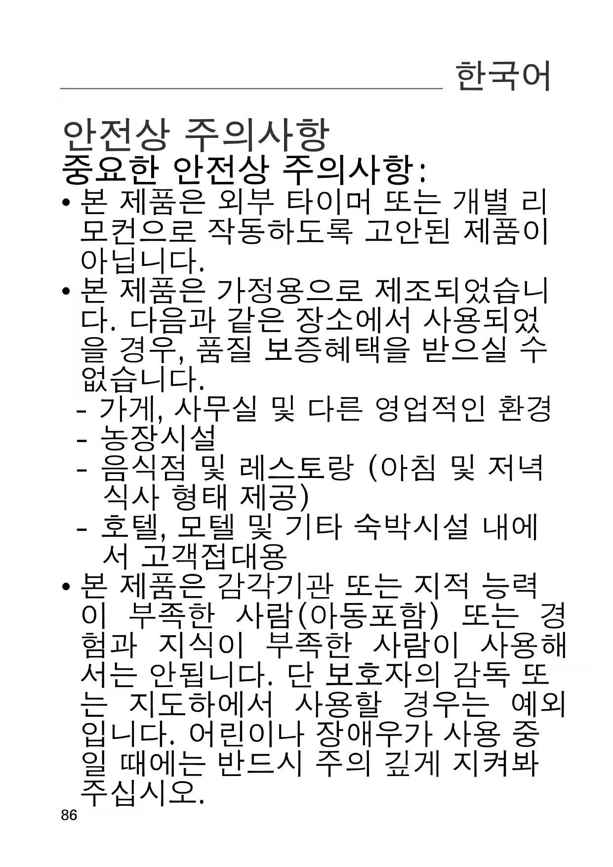 - 본 제품은 감각기관 또는 지적 능력 이 부족한 사람(아동포함) 또는 경 험과 지식이 부족한 사람이 사용해 서는 안됩니다. 단 보호자의 감독 또 는 지도하에서 사용할 경우는 예외 입니다. 어린이나 장애우가 사용 중 일 때에는 반드시 주의 깊게 지켜봐 주십시오.87
