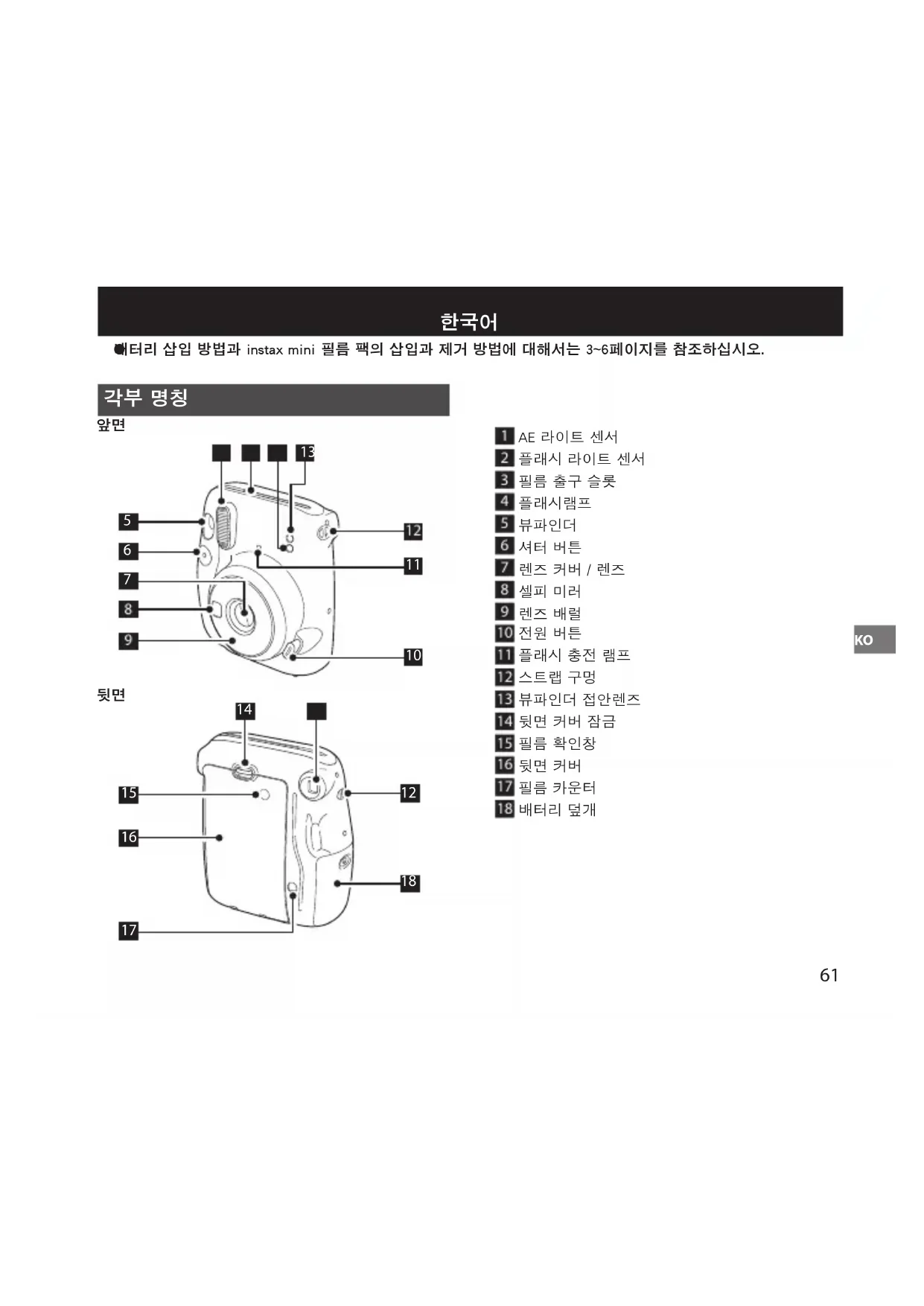 배터리 삽입 방법과 instax mini 필름 팩의 삽입과 제거 방법에 대해서는 3~6페이지를 참조하십시오.62