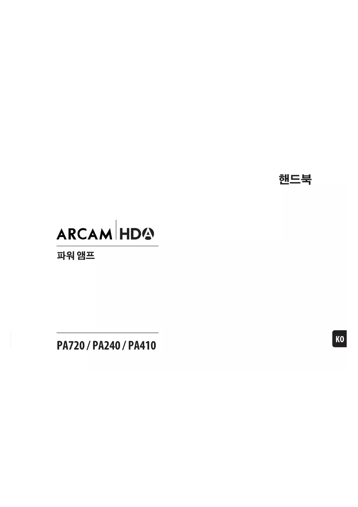 감사하고 축하드립니다... ...Arcam PA720, PA240 or PA410 파워 앰프를 구매하셨습니다. Arcam은 40년 이상 뛰어난 품질의 전문 오디오 제품을 생산해 왔으며 새로 출시된 PA720, PA240 and PA410 파워 앰프는 오랜 수상 경력에 빛나는 Hi-Fi 제품 라인의 최신 제품입니다. HDA 제품군의 디자인은 영국에서 가장 존경받는 오디오 회사 중 하나인 Arcam의 모든 경험을 바탕으로 하며, 장기간의 청취 즐거움을 제공하기 위해 설계되고 제작된 Arcam 최고의 멀티채널 파워 앰프 제품군을 생산하고 있습니다. 이 핸드북은 PA720, PA240 and PA410 설치와 사용을 위한 안내서이며 고급 기능에 대한 정보가 포함되어 있습니다. 다음 페이지의 목차 목록을 사용하여 원하는 섹션으로 갈 수 있습니다. 구매하신 제품을 오랫동안 작동에 문제없이 사용하시길 바랍니다. 혹시라도 결함이 발생하거나 Arcam 제품에 대한 추가 정보가 필요하시면, 당사의 대리점에서 도움을 드릴 것입니다. 더 자세한 정보는 Arcam 웹 사이트 www.arcam.co.uk에서 보실 수 있습니다. PA720, PA240 and PA410 개발팀 드림KO-3
