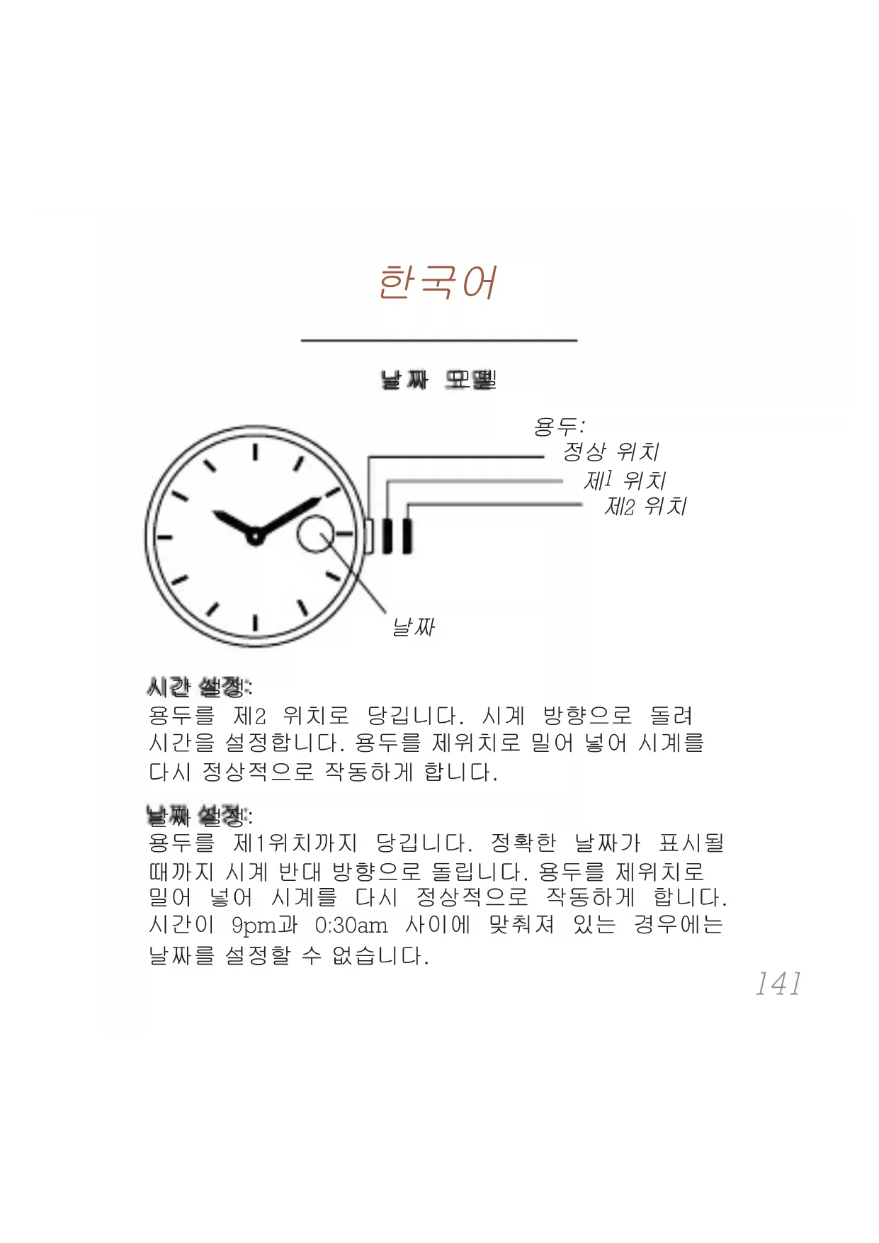 용두를 제1위치까지 당깁니다. 정확한 날짜가 표시될 때까지 시계 반대 방향으로 돌립니다. 용두를 제위치로 밀어 넣어 시계를 다시 정상적으로 작동하게 합니다. 시간이 9pm과 0:30am 사이에 맞춰져 있는 경우에는 날짜를 설정할 수 없습니다. 날짜 설정:143