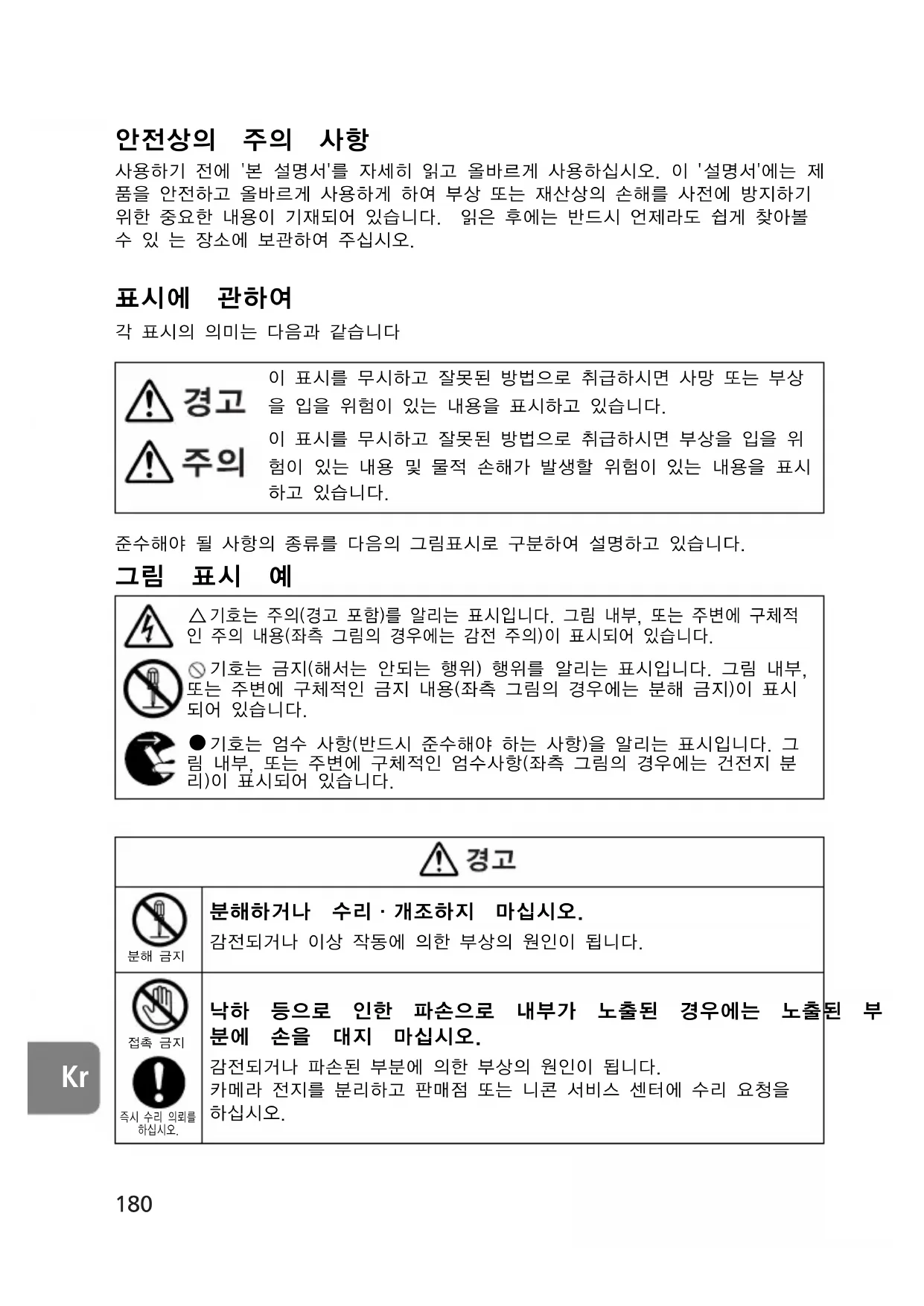 ●기호는 엄수 사항(반드시 준수해야 하는 사항)을 알리는 표시입니다. 그 림 내부, 또는 주변에 구체적인 엄수사항(좌측 그림의 경우에는 건전지 분 리)이 표시되어 있습니다. 접촉 금지즉시 수리 의뢰를하십시오.분해 금지 분해하거나 수리·개조하지 마십시오. 감전되거나 이상 작동에 의한 부상의 원인이 됩니다. 낙하 등으로 인한 파손으로 내부가 노출된 경우에는 노출된 부 분에 손을 대지 마십시오. 감전되거나 파손된 부분에 의한 부상의 원인이 됩니다. 카메라 전지를 분리하고 판매점 또는 니콘 서비스 센터에 수리 요청을 하십시오.181