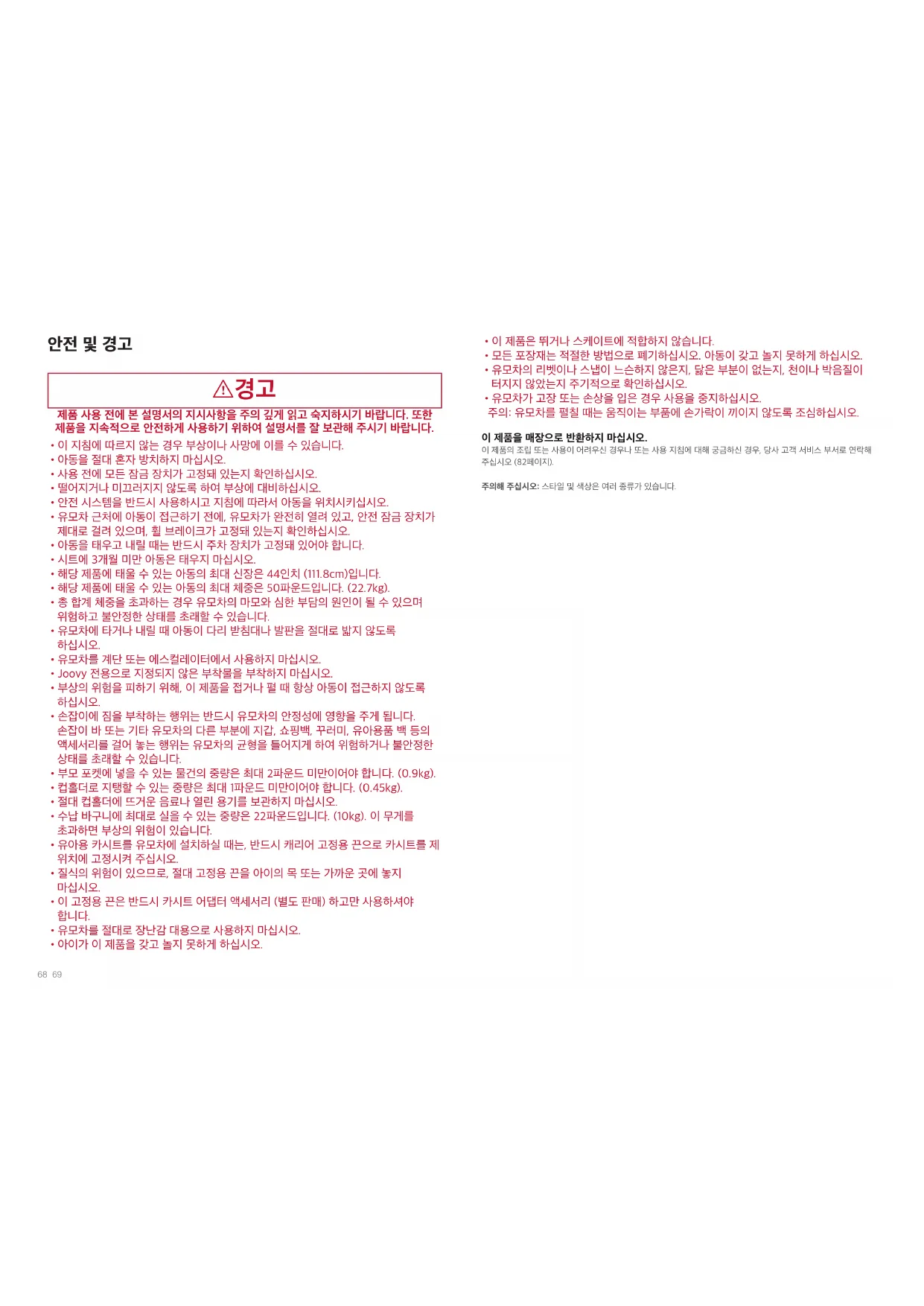 - 유모차가 고장 또는 손상을 입은 경우 사용을 중지하십시오. 주의: 유모차를 펼칠 때는 움직이는 부품에 손가락이 끼이지 않도록 조심하십시오. 이 제품을 매장으로 반환하지 마십시오. 이 제품의 조립 또는 사용이 어려우신 경우나 또는 사용 지침에 대해 궁금하신 경우, 당사 고객 서비스 부서로 연락해 주십시오 (82페이지). 주의해 주십시오: 스타일 및 색상은 여러 종류가 있습니다.70 71