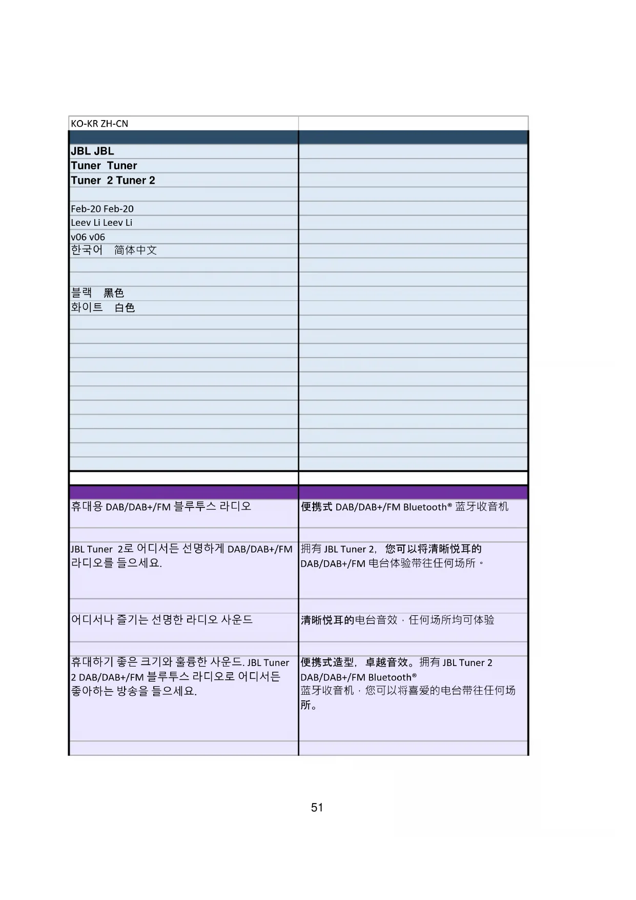 频率,享受清晰悦耳的 JBL 专业音效。 무선 블루투스 스트리밍 无线 Bluetooth® 蓝牙播放 52좋아하는 모든 방송을 청취하세요. JBL Tuner 2를 블루투스로 스마트폰이나 태블릿에 연결하고 라디오에서 재생목록으로 빠르게