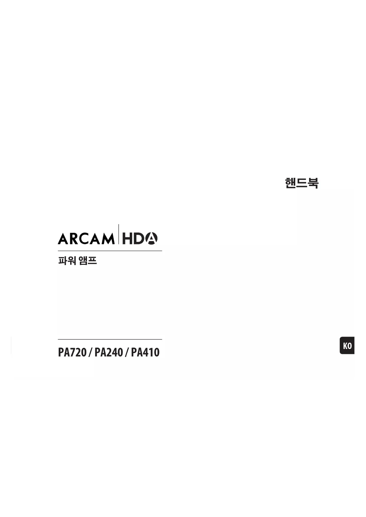 감사하고 축하드립니다... ...Arcam PA720, PA240 or PA410 파워 앰프를 구매하셨습니다. Arcam은 40년 이상 뛰어난 품질의 전문 오디오 제품을 생산해 왔으며 새로 출시된 PA720, PA240 and PA410 파워 앰프는 오랜 수상 경력에 빛나는 Hi-Fi 제품 라인의 최신 제품입니다. HDA 제품군의 디자인은 영국에서 가장 존경받는 오디오 회사 중 하나인 Arcam의 모든 경험을 바탕으로 하며, 장기간의 청취 즐거움을 제공하기 위해 설계되고 제작된 Arcam 최고의 멀티채널 파워 앰프 제품군을 생산하고 있습니다. 이 핸드북은 PA720, PA240 and PA410 설치와 사용을 위한 안내서이며 고급 기능에 대한 정보가 포함되어 있습니다. 다음 페이지의 목차 목록을 사용하여 원하는 섹션으로 갈 수 있습니다. 구매하신 제품을 오랫동안 작동에 문제없이 사용하시길 바랍니다. 혹시라도 결함이 발생하거나 Arcam 제품에 대한 추가 정보가 필요하시면, 당사의 대리점에서 도움을 드릴 것입니다. 더 자세한 정보는 Arcam 웹 사이트 www.arcam.co.uk에서 보실 수 있습니다. PA720, PA240 and PA410 개발팀 드림KO-3