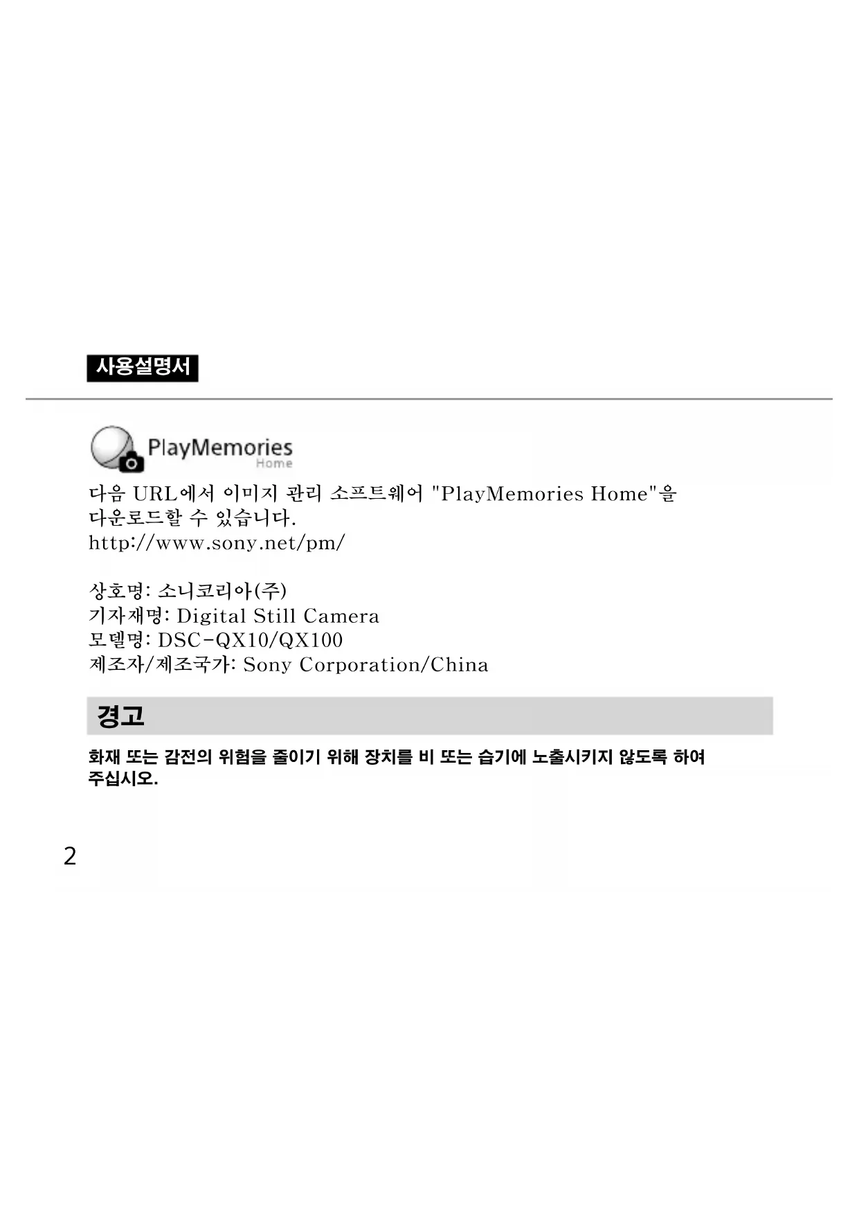 다음 URL에서 이미지 관리 소프트웨어 "PlayMemories Home"을 다운로드할 수 있습니다. http://www.sony.net/pm/ 상호명: 소니코리아(주) 기자재명: Digital Still Camera 모델명: DSC-QX10/QX100 제조자/제조국가: Sony Corporation/China