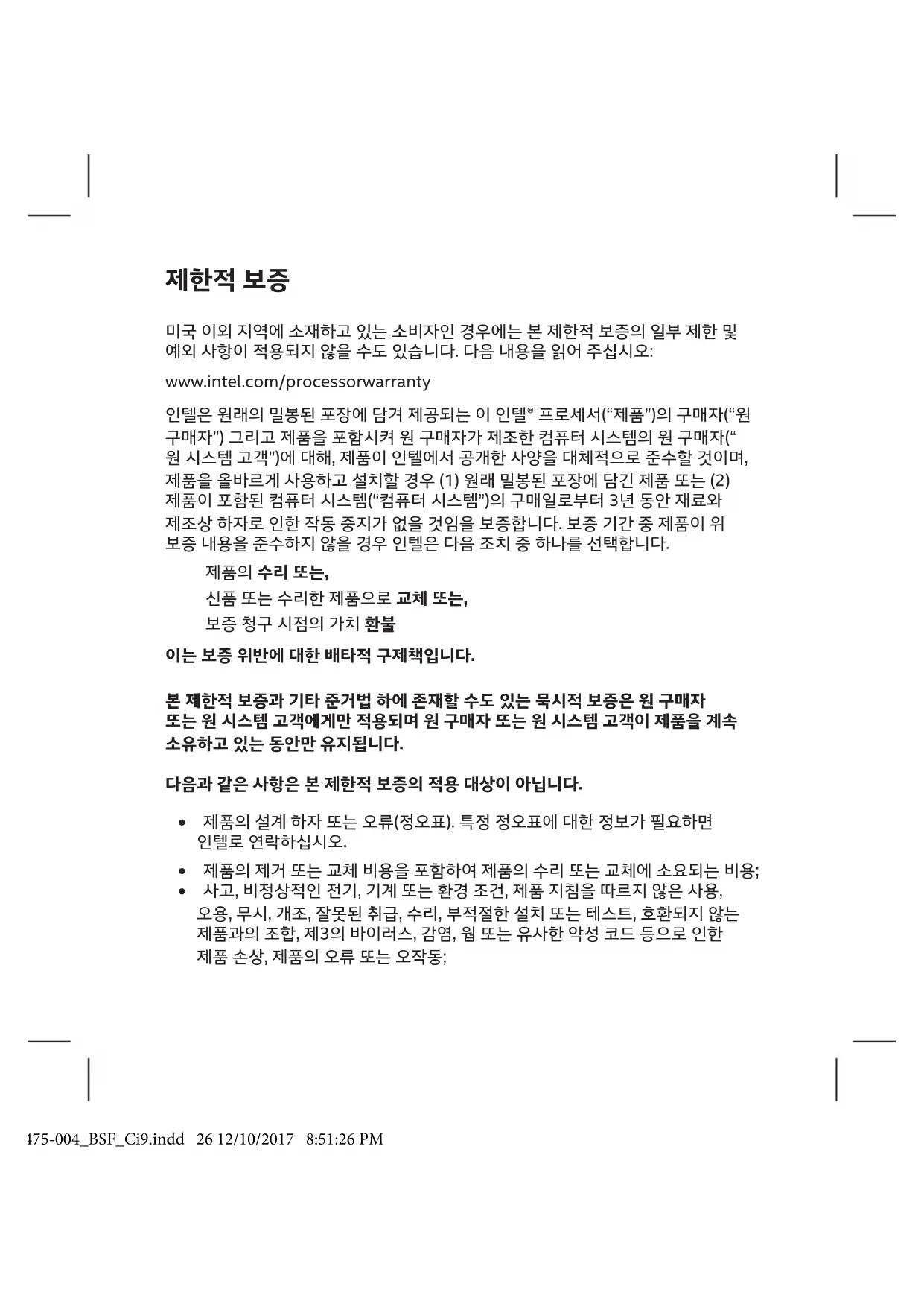 J61475-004_BSF_Ci9.indd 27 12/10/2017 8:51:26 PM보증 제한 및 예외 본 보증은 제품에 대한 다른 모든 보증과 표현에 우선합니다. 인텔은 다른 모든 명시적 보증과 이행 과정, 거래 과정 또는 상관습으로 인해 발생하는 여타의 보증을 모두 부인합니다. 상업성, 특정 목적에의 적합성 및 비침해에 대한 묵시적 보증을 포함하여 (이에 제한되지 않음) 일체의 묵시적 보증은 제한적 보증 기간 동안으로 제한됩니다. 해당 보증 기간 이후에는 보증이 적용되지 않습니다. 일부 주(또는 사법권)에서는 묵시적 보증의 배제와 기간에 대한 제한을 허용하지 않으므로 위 제한이 귀하에게 적용되지 않을 수도 있습니다.