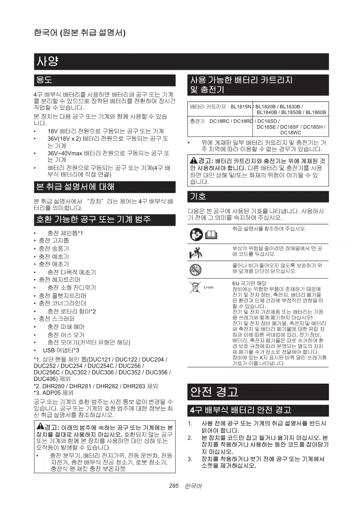 4구 배부식 배터리 취급 설명서 285