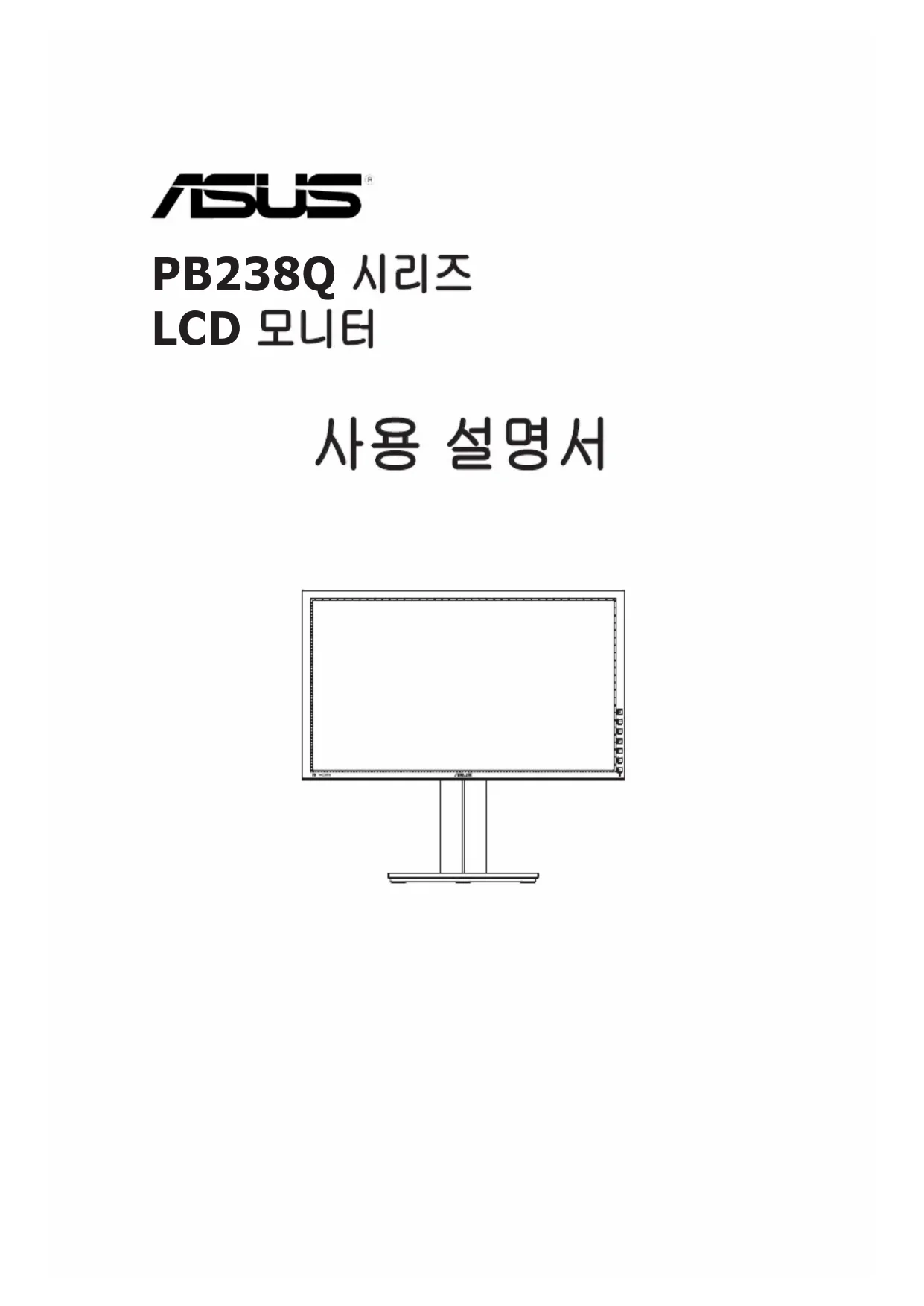 PB238Q 시리즈 LCD 모니터 사용 설명서ii Copyright © 2012 ASUSTeK COMPUTER INC. 모든 권리는 당사가 소유합니다. ASUSTeK COMPUTER INC. (“ASUS”)의 명시적 서면 승인을 얻지 않을 경우, 백업을 위해 구매자가 보관하는 문서를 제외하고, 이 설명서와 이 설명서에서 설명된 제품과 소프트웨어의 어떤 부분도 어떤 형태로든 또는 어떤 방식으로든 복제, 전송, 필사될 수 없고, 검색 시스템에 저장될 수 없으며 어떤 언어로든 번역될 수 없습니다. 다음의 경우 제품 보증 또는 서비스가 연장되지 않습니다. (1) ASUS로부터 수리, 변경 또는 교체에 서면 허가가 없는 상태에서 제품을 수리, 변경 또는 교체하거나 (2) 제품의 일련 번호가 지워지거나 없어진 경우 ASUS는 이 설명서를 상품성 또는 특정 목적에 대한 적합성에 대한 묵시적 보증 또는 조건을 포함하여 어떤 종류의 명시적 또는 묵시적 보증도 없이 “있는 그대로” 제공합니다. 어떤 경우에도 ASUS, 그 중역, 간부, 직원 또는 대리점은 이 설명서 또는 제품의 일체의 결함 또는 오류로 인한 어떤 간접적, 특수한, 우발적 또는 결과적 손해(이윤 손실, 사업 손실, 사용 손실 또는 데이터 손실, 영업 중단 등)에 대해서도 책임지지 않으며, ASUS가 그러한 손해의 가능성에 대해 경고를 받았다 하더라도 책임지지 않습니다. 이 설명서에 포함된 규격과 정보는 참고용으로만 제공되며, 예고 없이 언제든지 변경될 수 있으며 따라서 ASUS의 약속으로 해석되면 안 됩니다. ASUS는 이 설명서와 이 설명서에서 설명되는 제품과 소프트웨어에서 나타날 수 있는 일체의 오류 또는 부정확함에 대해서 어떤 책임도 지지 않습니다. 이 설명서에 나와 있는 제품 이름과 회사 이름은 각 회사의 등록 상표 또는 저작권일 수도 있고 아닐 수도 있으며, 권리 침해에 대한 의도가 없이 식별 또는 설명을 위해서만 사용되며, 또한 소유자에게 이롭게