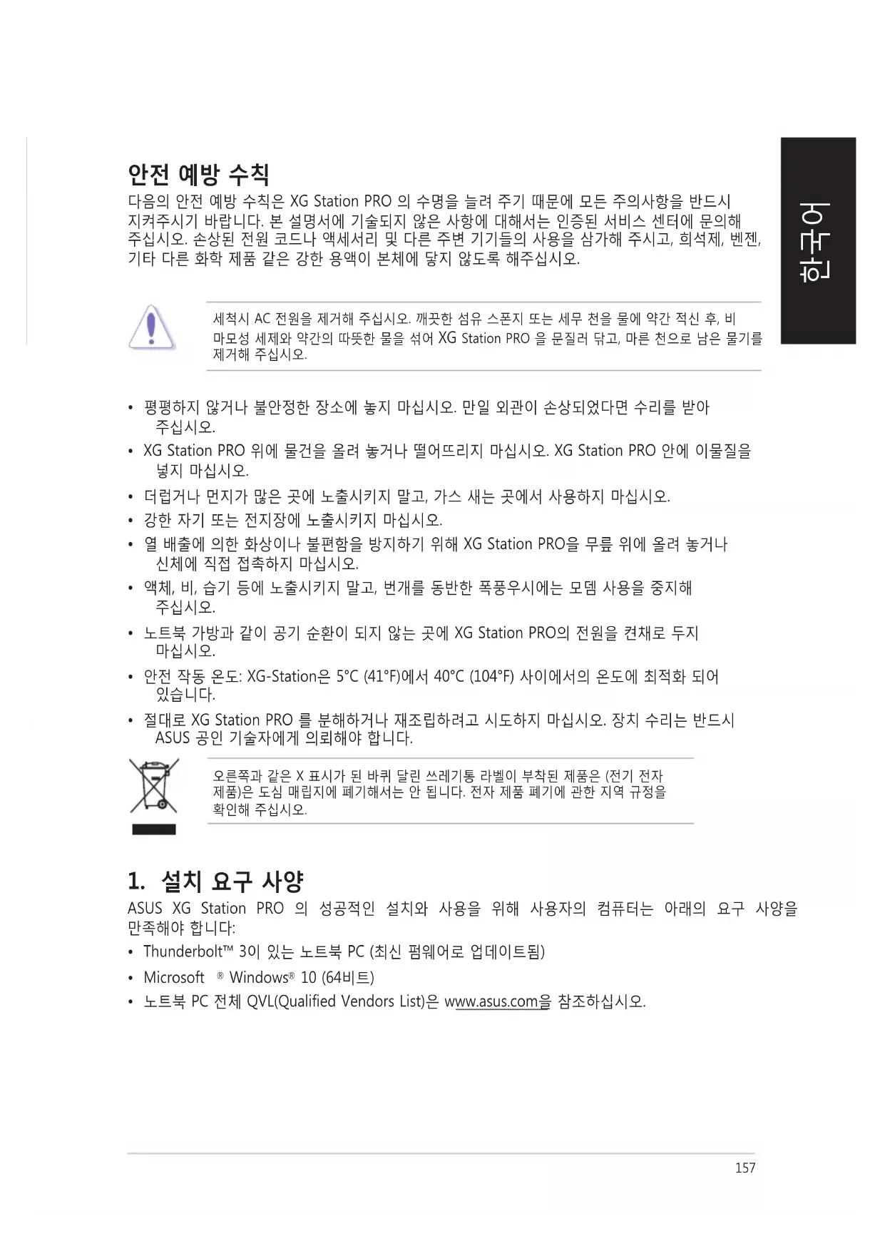 - 노트북 PC 전체 QVL(Qualified Vendors List)은 www.asus.com을 참조하십시오. 오른쪽과 같은 X 표시가 된 바퀴 달린 쓰레기통 라벨이 부착된 제품은 (전기 전자 제품)은 도심 매립지에 폐기해서는 안 됩니다. 전자 제품 폐기에 관한 지역 규정을 확인해 주십시오.158