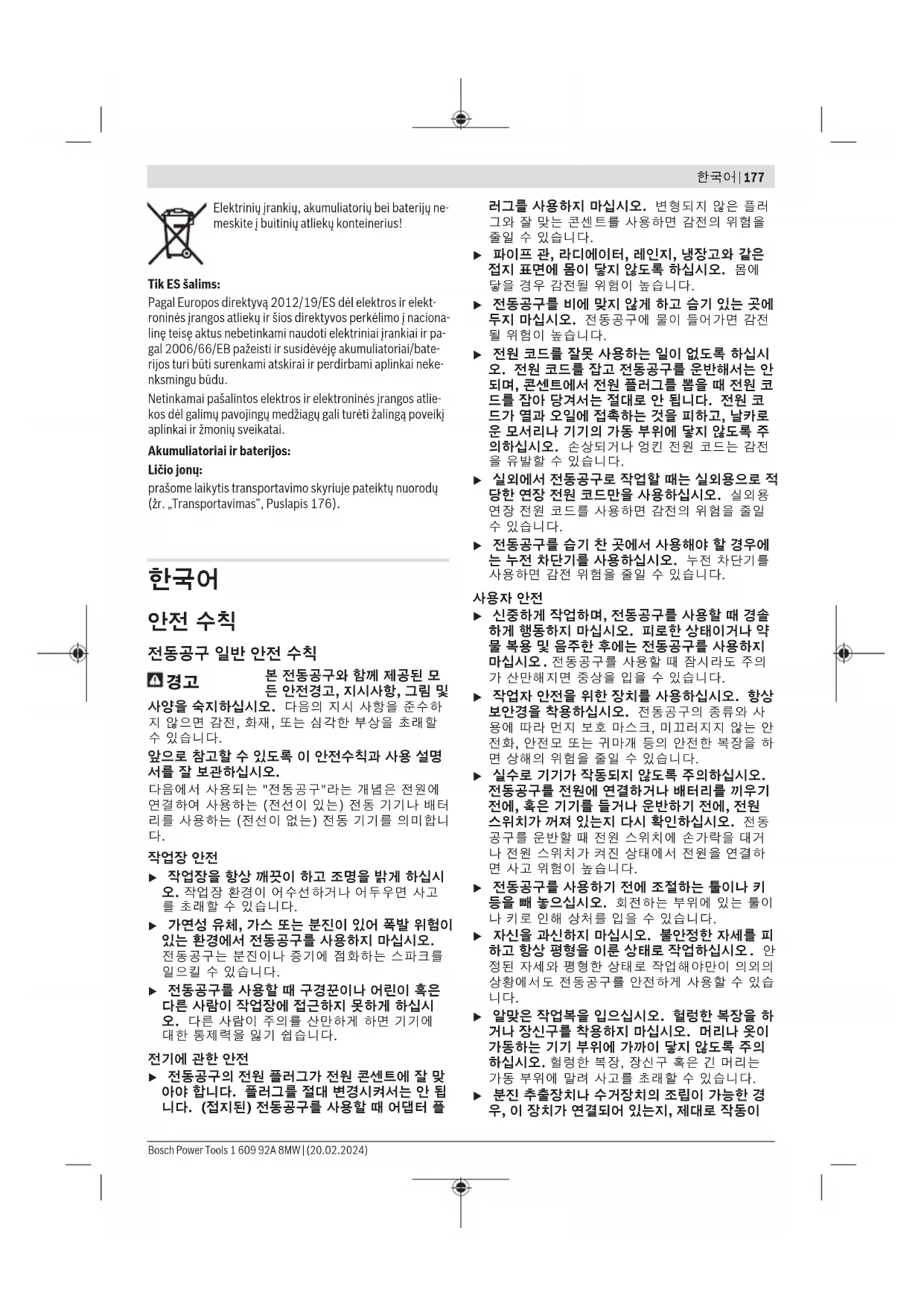 Bosch Power Tools 1 609 92A 8MW | (20.02.2024)180 | 한국어 u 전동공구가 자동으로 작동이 중단된 경우 전원 스위치를 계속 누르지 마십시오. 배터리가 손상