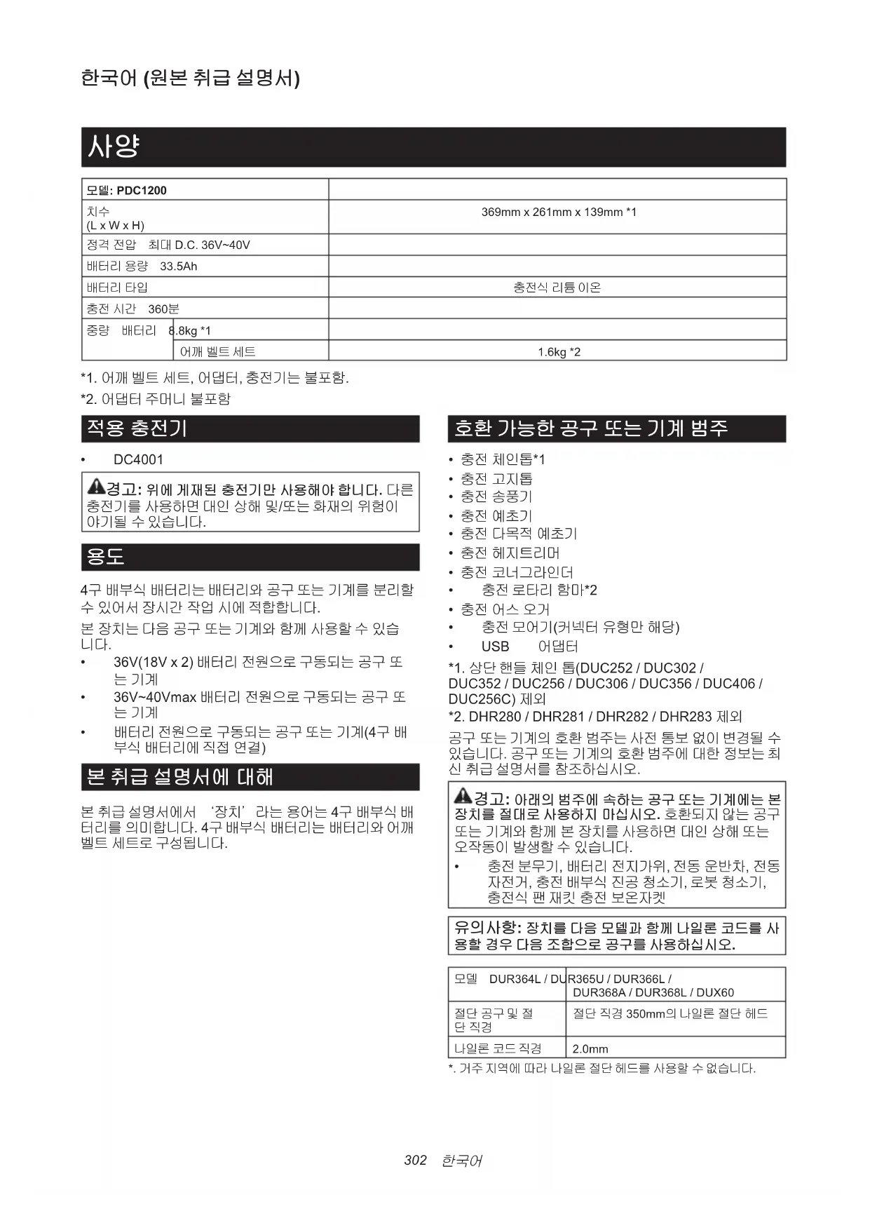 - 충전 분무기, 배터리 전지가위, 전동 운반차, 전동 자전거, 충전 배부식 진공 청소기, 로봇 청소기, 충전식 팬 재킷 충전 보온자켓 유의사항: 장치를 다음 모델과 함께 나일론 코드를 사 용할 경우 다음 조합으로 공구를 사용하십시오. 모델 DUR364L / DUR365U / DUR366L / DUR368A / DUR368L / DUX60
