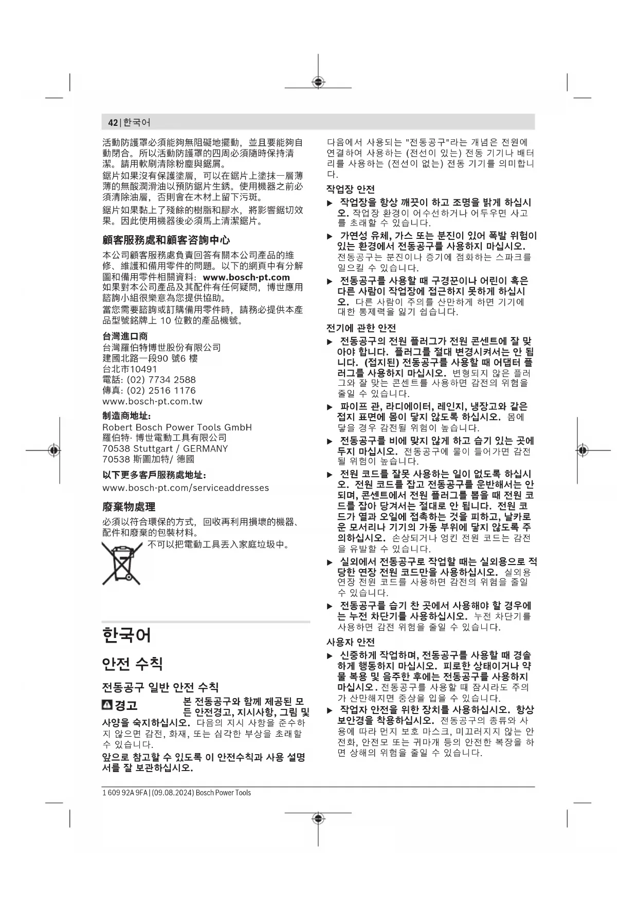 u 전동공구를 내려놓기 전에 기기가 완전히 멈추었 는지 확인하십시오. 삽입공구가 걸리거나 전동공 구에 대한 통제가 어려워질 수 있습니다. u 고속강(HSS)으로 된 톱날은 사용하지 마십시오. 이런 톱날은 쉽게 부러질 수 있습니다. u 철금속에 작업하지 마십시오. 달아오른 칩은 집 진 시 점화될 수 있습니다. u 분진 마스크를 착용하십시오. 1 609 92A 9FA | (09.08.2024) Bosch Power Tools한국어 | 45