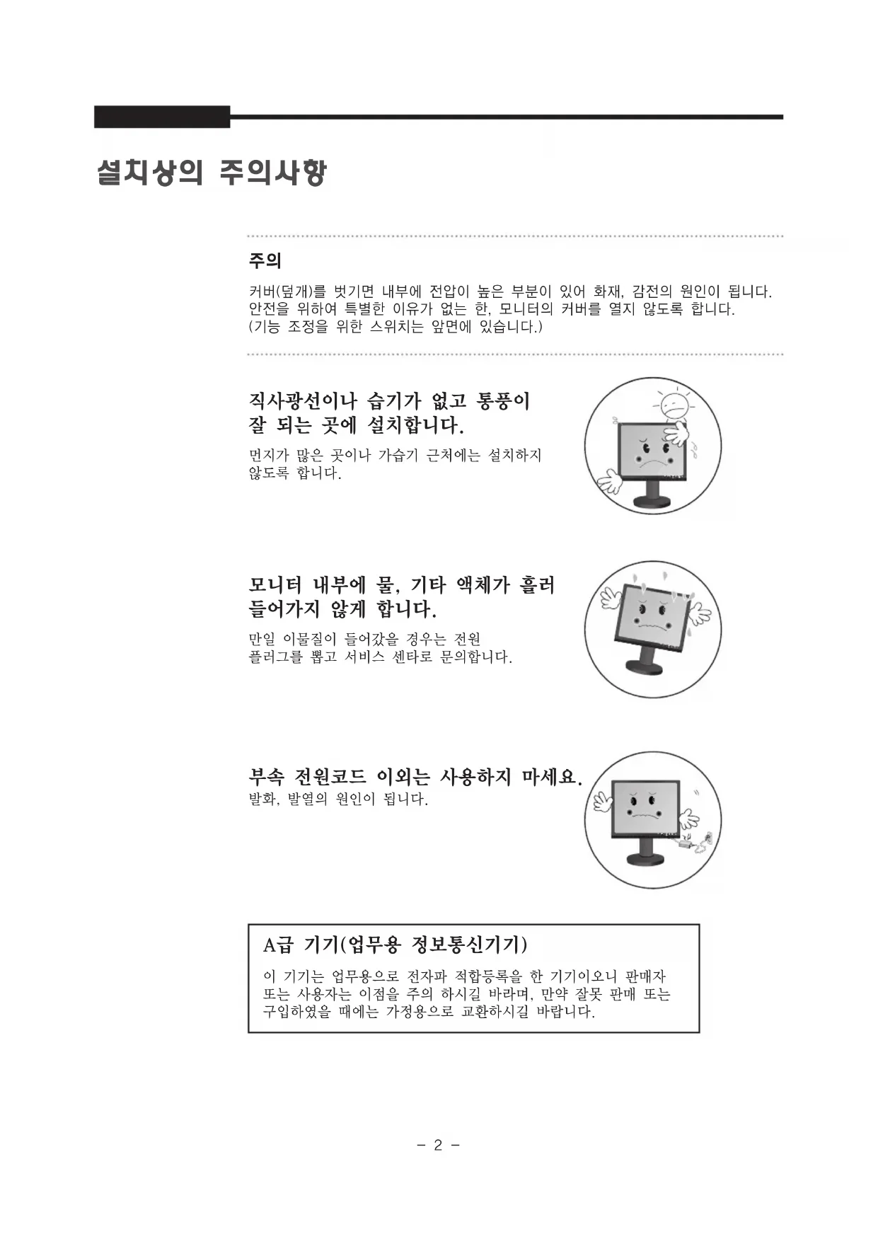 모니터 내부에 물, 기타 액체가 흘러 들어가지 않게 합니다. 만일 이물질이 들어갔을 경우는 전원 플러그를 뽑고 서비스 센타로 문의합니다. 부속 전원코드 이외는 사용하지 마세요. 발화, 발열의 원인이 됩니다. A급 기기(업무용 정보통신기기) 이 기기는 업무용으로 전자파 적합등록을 한 기기이오니 판매자 또는 사용자는 이점을 주의 하시길 바라며, 만약 잘못 판매 또는 구입하였을 때에는 가정용으로 교환하시길 바랍니다. - -USER'S MANUAL 온도가 너무 높거나 낮은 곳에는 설치하지않도록 합니다. 갑작스런 온도 변화는 습기를 발생하고 모니터를 오동작시킬 수 있습니다.