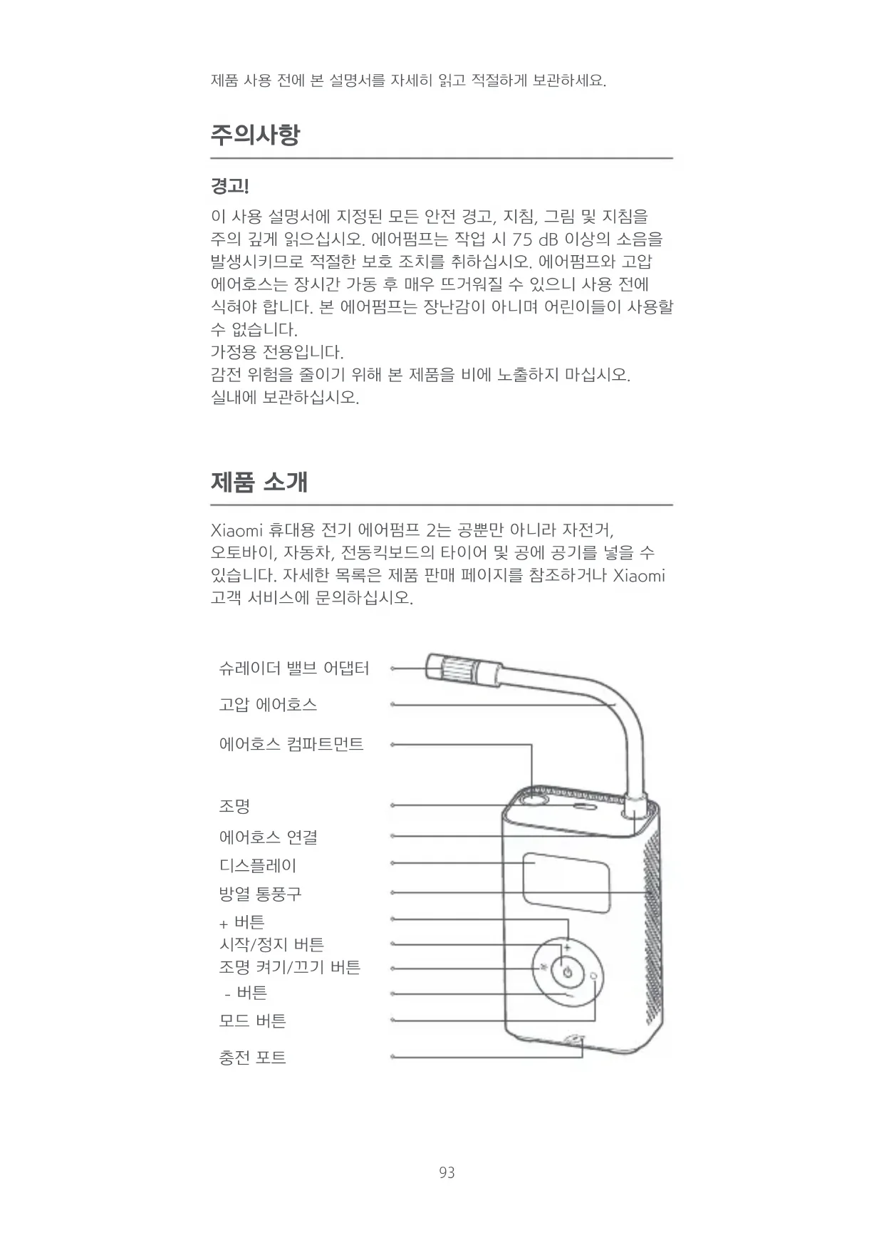 이 사용 설명서에 지정된 모든 안전 경고, 지침, 그림 및 지침을 주의 깊게 읽으십시오. 에어펌프는 작업 시 75 dB 이상의 소음을 발생시키므로 적절한 보호 조치를 취하십시오. 에어펌프와 고압 에어호스는 장시간 가동 후 매우 뜨거워질 수 있으니 사용 전에 식혀야 합니다. 본 에어펌프는 장난감이 아니며 어린이들이 사용할