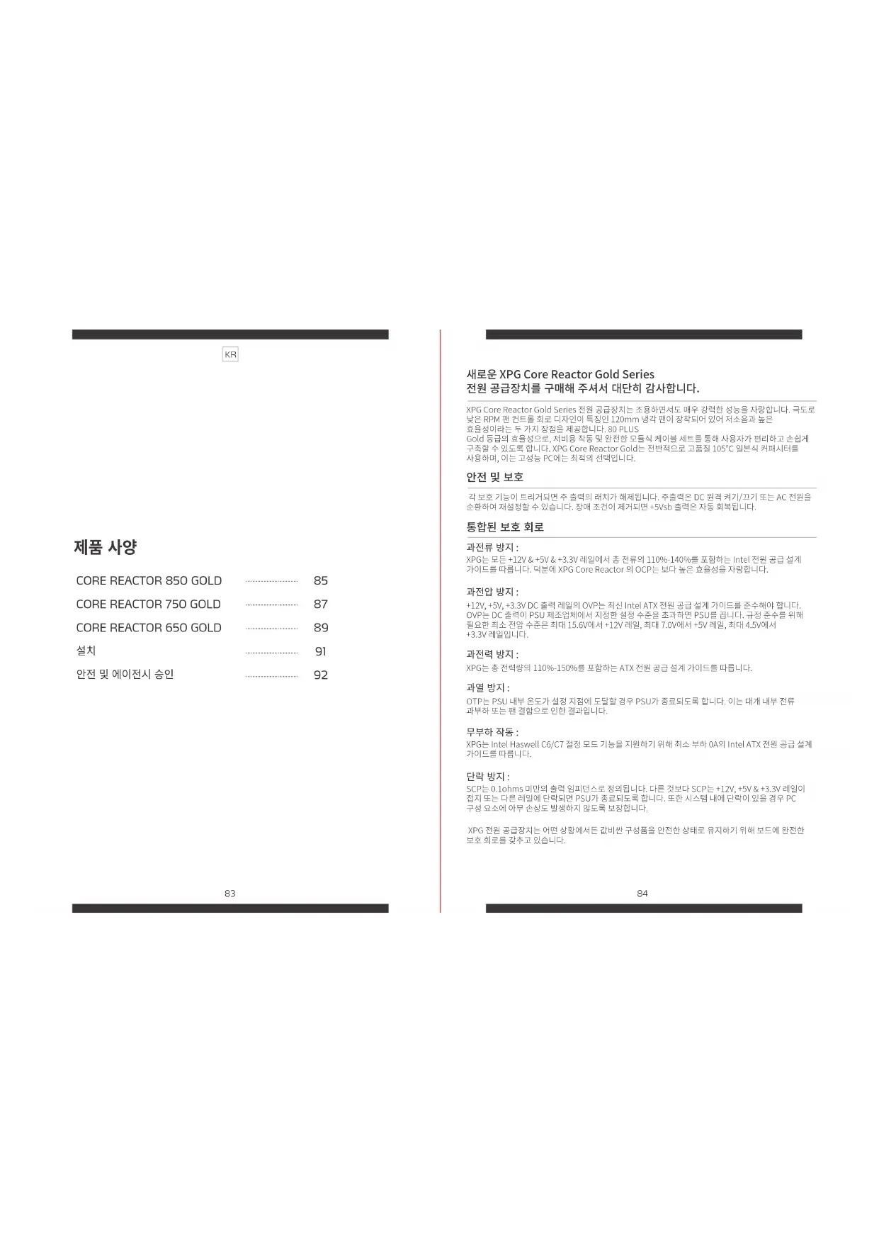 새로운 XPG Core Reactor Gold Series 전원공급장치를구매해주셔서대단히감사합니다. XPG Core Reactor Gold Series 전원 공급장치는 조용하면서도 매우 강력한 성능을 자랑합니다. 극도로 낮은 RPM 팬 컨트롤 회로 디자인이 특징인 120mm 냉각 팬이 장착되어 있어 저소음과 높은 효율성이라는 두 가지 장점을 제공합니다. 80 PLUS Gold 등급의 효율성으로, 저비용 작동 및 완전한 모듈식 케이블 세트를 통해 사용자가 편리하고 손쉽게 구축할 수 있도록 합니다. XPG Core Reactor Gold는 전반적으로 고품질 105°C 일본식 커패시터를 사용하며, 이는 고성능 PC에는 최적의 선택입니다.