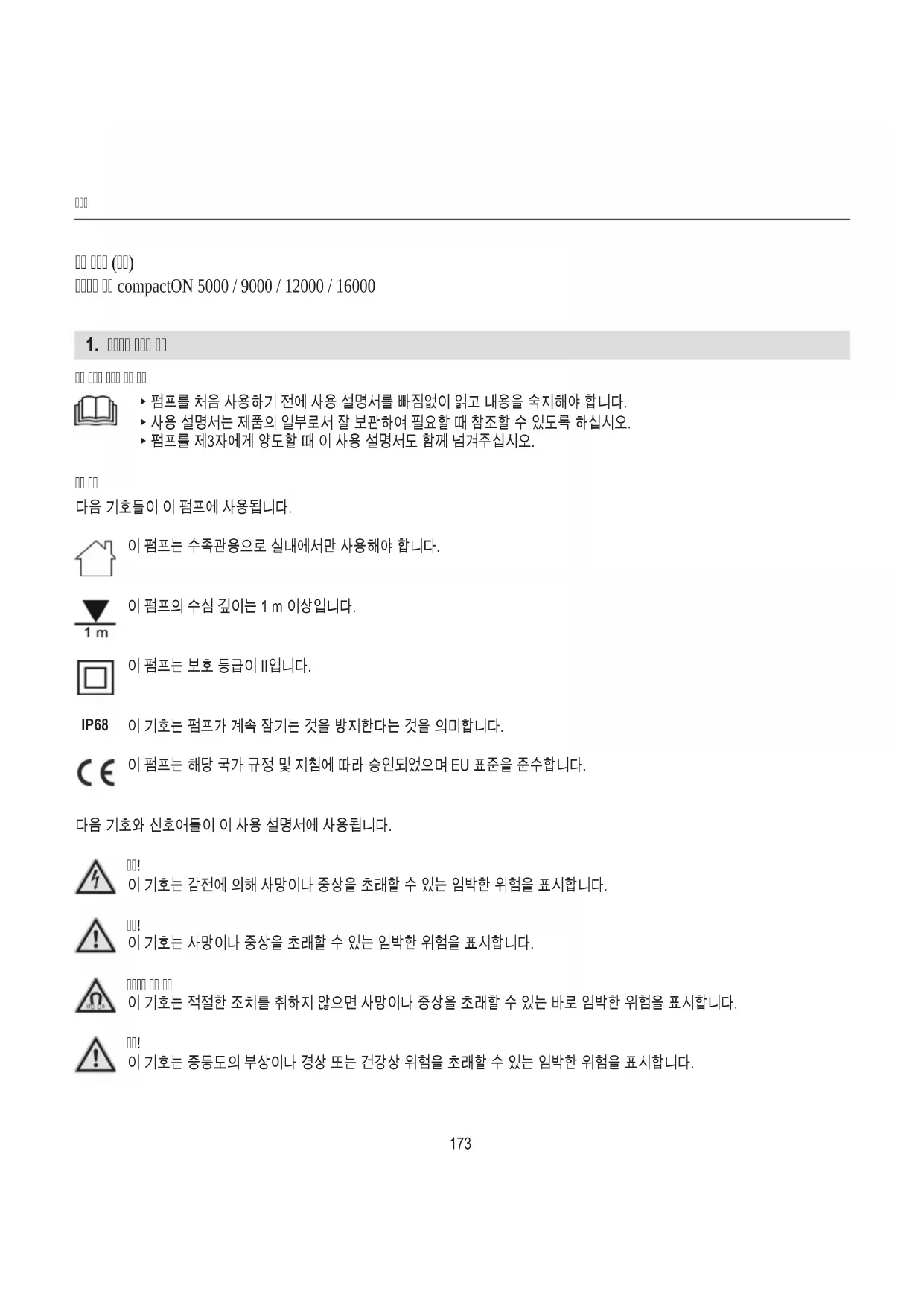 사용 설명서 사용을 위한 정보 ▶ 펌프를 처음 사용하기 전에 사용 설명서를 빠짐없이 읽고 내용을 숙지해야 합니다. ▶ 사용 설명서는 제품의 일부로서 잘 보관하여 필요할 때 참조할 수 있도록 하십시오. ▶ 펌프를 제3자에게 양도할 때 이 사용 설명서도 함께 넘겨주십시오.