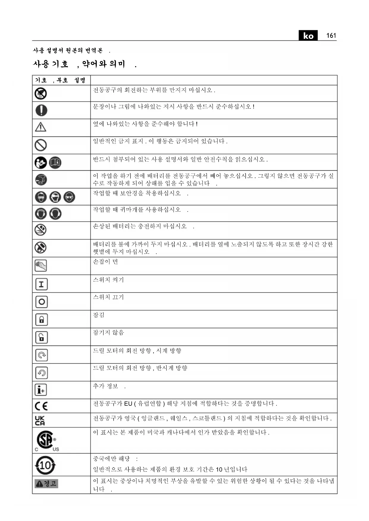 사용 설명서 원본의 번역본 . 사용 기호 , 약어와 의미 .