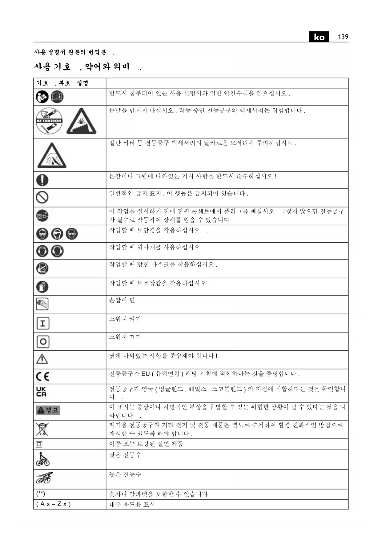 작업할 때 공구로 보이지 않는 전선이나 기기 자체의 코드 에 접촉할 위험이 있는 경우 반드시 기기의 절연된 손잡이 면만을 잡으십시오 . 전류가 흐르는 전선에 닿게 되면 기 기의 금속 부위에 전기가 통해 감전이 될 수 있습니다 . 고정장치나 다른 실용적인 방법을 사용하여 작업물을 바 닥에 안정되게 고정하고 받쳐 주십시오. 작업물을 손이나 몸으로만 잡고 있으면 작업 시 위치가 불안정하게 되어 기 기에 대한 통제를 잃을 수 있습니다 . 전동공구 제조사가 특별히 개발하거나 허용하지 않은 액 세서리를 사용하지 마십시오 . 액세서리가 귀하의 전동공 구에 맞는다고 해서 안전한 작동을 보장하는 것이 아닙니 특히 톱날이나 기타 절단 커터를 손잡이 부분으로 향하게 하여 작업할 경우 , 이에 닿지 않도록 전동공구를 안전하 게 잡으십시오 . 날카로운 톱날이나 모서리에 접촉하게 되 면 상해를 입을 수 있습니다 . 작업자는 보호장비를 착용해야 합니다. 작업에 따라 안면 마스크나 보안경을 사용하십시오 . 필요한 경우 분진 마스 크 , 귀마개 , 보호장갑을 사용하고 연마로 인한 미세한 소 재 분자에 접하게 되는 것을 방지하는 특수 작업용 애프런 을 착용하십시오 . 다양한 작업을 할 때 공중에 떠다니는 이물질로부터 눈을 보호해야 합니다. 분진 마스크로 기기 사용 시 발생하는 분진을 여과해야 합니다. 작업자가 장기간 강한 소음 환경에서 작업하면 청력을 상 실할 수도 있습니다 . 전동공구를 작업자 자신이나 다른 사람 혹은 동물에 향하 게 하지 마십시오 . 날카롭거나 뜨거운 액세서리로 인해 상해를 입을 수 있습니다 . 전동공구에 있는 상표나 표지를 나사로 조이거나 리벳을 박으면 안됩니다 . 절연 상태가 손상되면 감전으로부터 안전하지 못합니다 .부호 국제 단위 국내 단위 설명