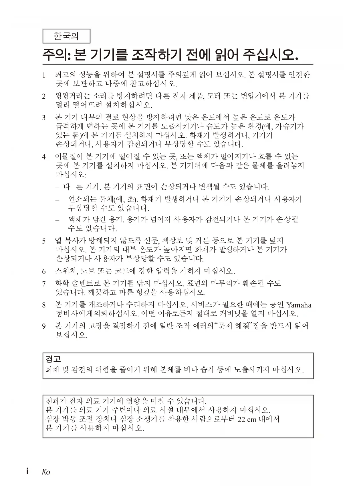 5 열 복사가 방해되지 않도록 신문, 책상보 및 커튼 등으로 본 기기를 덮지 마십시오. 본 기기의 내부 온도가 높아지면 화재가 발생하거나 본 기기가 손상되거나 사용자가 부상당할 수도 있습니다. 6 스위치, 노브 또는 코드에 강한 압력을 가하지 마십시오. 7 화학 솔벤트로 본 기기를 닦지 마십시오. 표면의 마무리가 훼손될 수도 있습니다. 깨끗하고 마른 헝겊을 사용하십시오. 8 본 기기를 개조하거나 수리하지 마십시오. 서비스가 필요한 때에는 공인 Yamaha