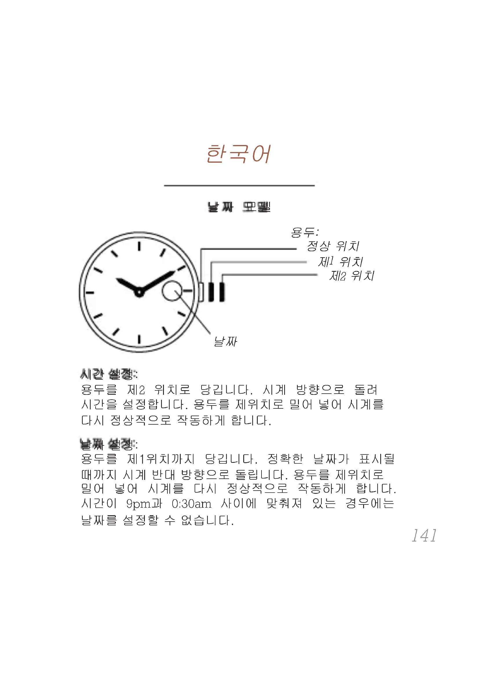 용두를 제1위치까지 당깁니다. 정확한 날짜가 표시될 때까지 시계 반대 방향으로 돌립니다. 용두를 제위치로 밀어 넣어 시계를 다시 정상적으로 작동하게 합니다. 시간이 9pm과 0:30am 사이에 맞춰져 있는 경우에는 날짜를 설정할 수 없습니다. 날짜 설정:143