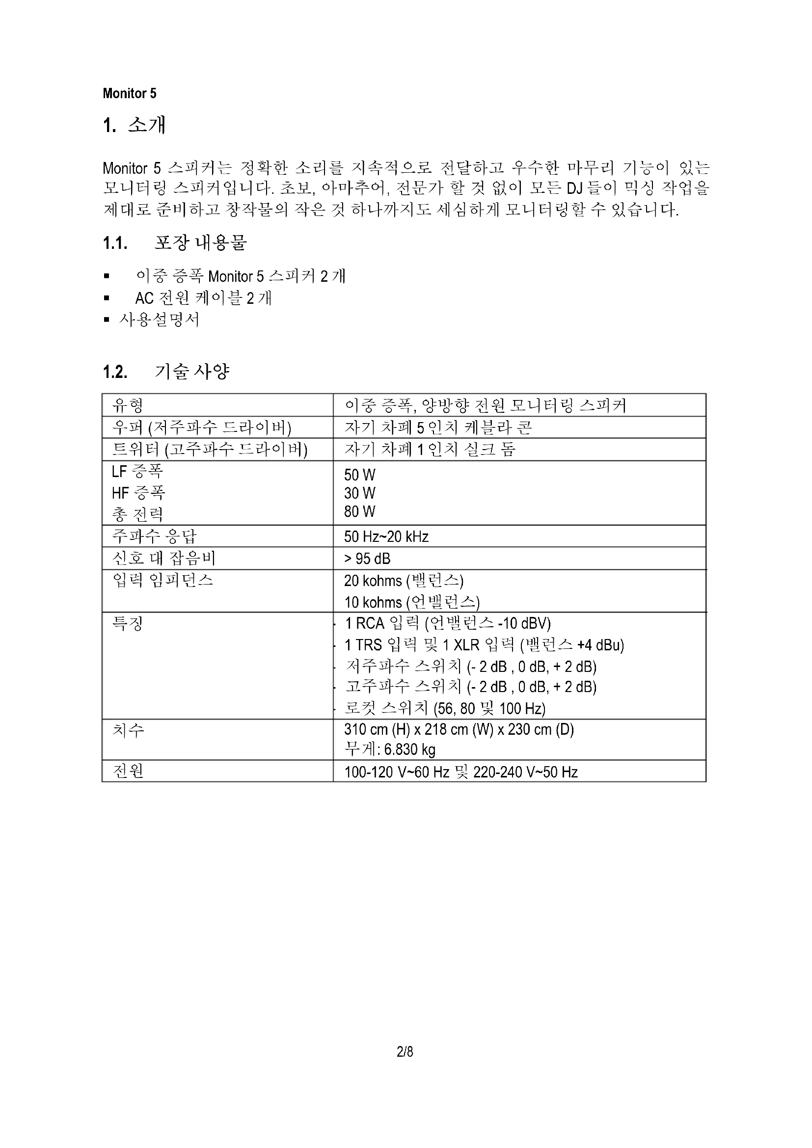 Monitor 5 스피커는 정확한 소리를 지속적으로 전달하고 우수한 마무리 기능이 있는 모니터링 스피커입니다. 초보, 아마추어, 전문가 할 것 없이 모든 DJ 들이 믹싱 작업을 제대로 준비하고 창작물의 작은 것 하나까지도 세심하게 모니터링할 수 있습니다. 1.1. 포장 내용물