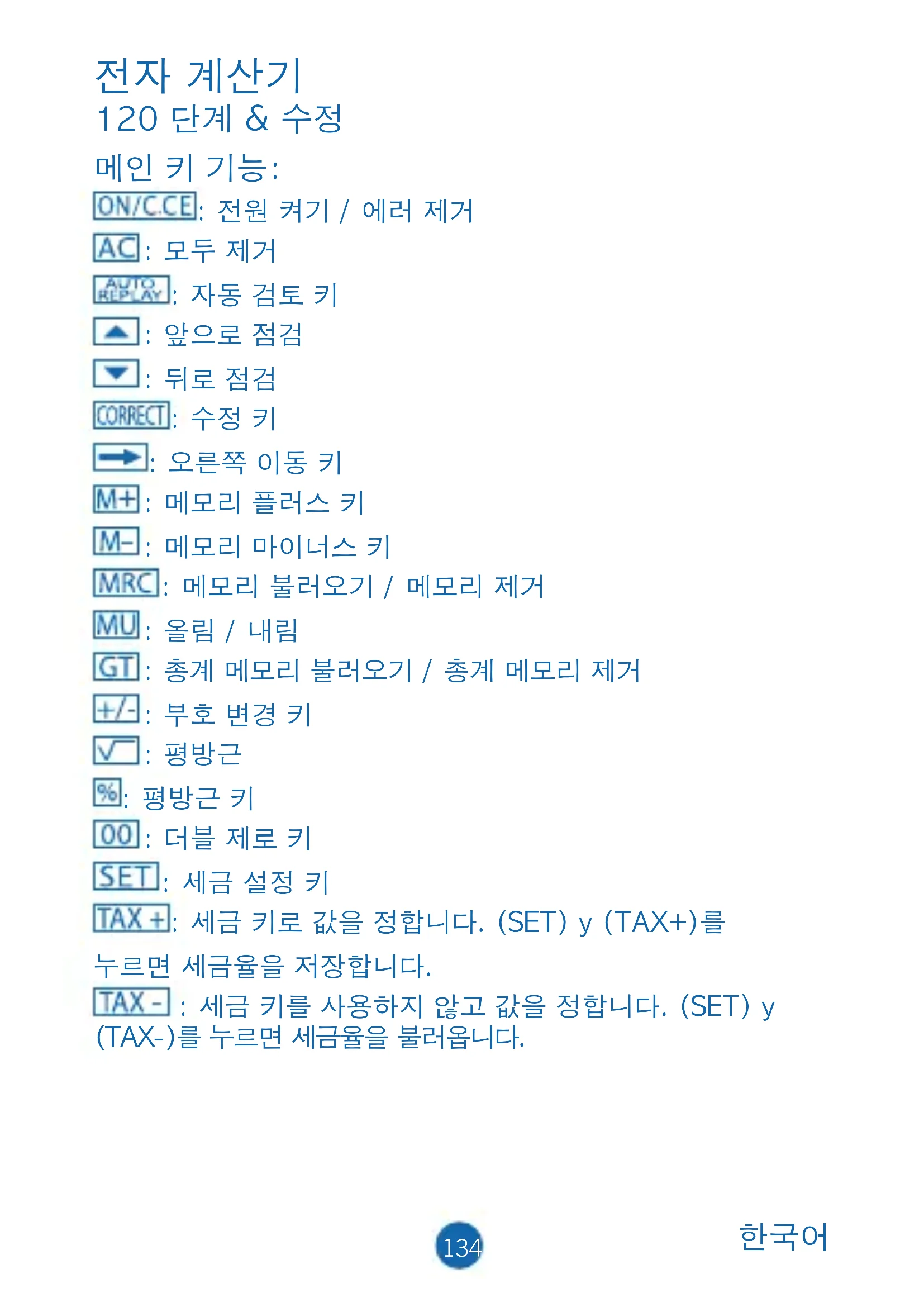 : 세금 키로 값을 정합니다. (SET) y (TAX+)를 누르면 세금율을 저장합니다. : 세금 키를 사용하지 않고 값을 정합니다. (SET) y (TAX-)를 누르면 세금율을 불러옵니다.135