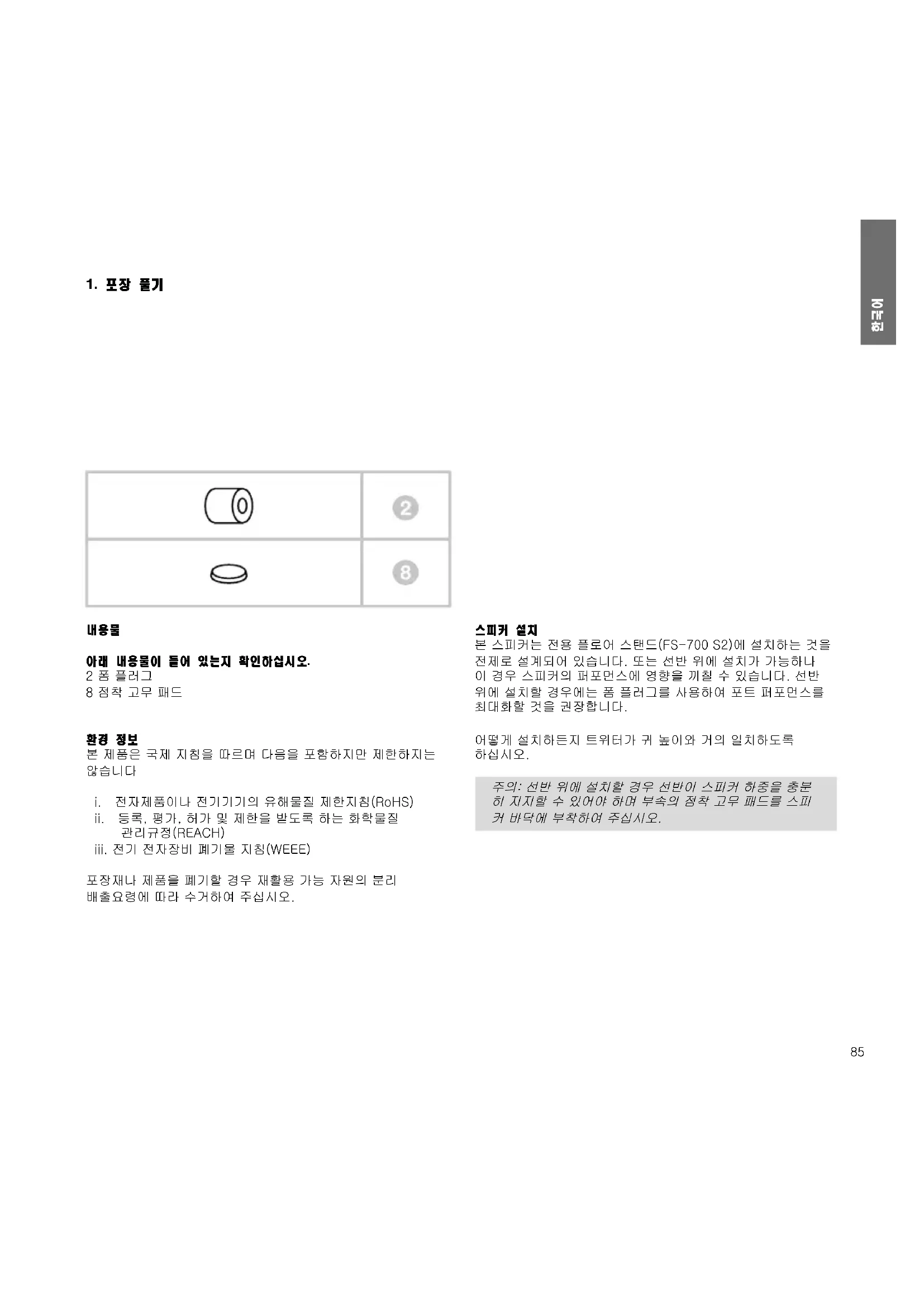 본 스피커는 전용 플로어 스탠드(FS-700 S2)에 설치하는 것을 전제로 설계되어 있습니다. 또는 선반 위에 설치가 가능하나 이 경우 스피커의 퍼포먼스에 영향을 끼칠 수 있습니다. 선반 위에 설치할 경우에는 폼 플러그를 사용하여 포트 퍼포먼스를 최대화할 것을 권장합니다. 어떻게 설치하든지 트위터가 귀 높이와 거의 일치하도록