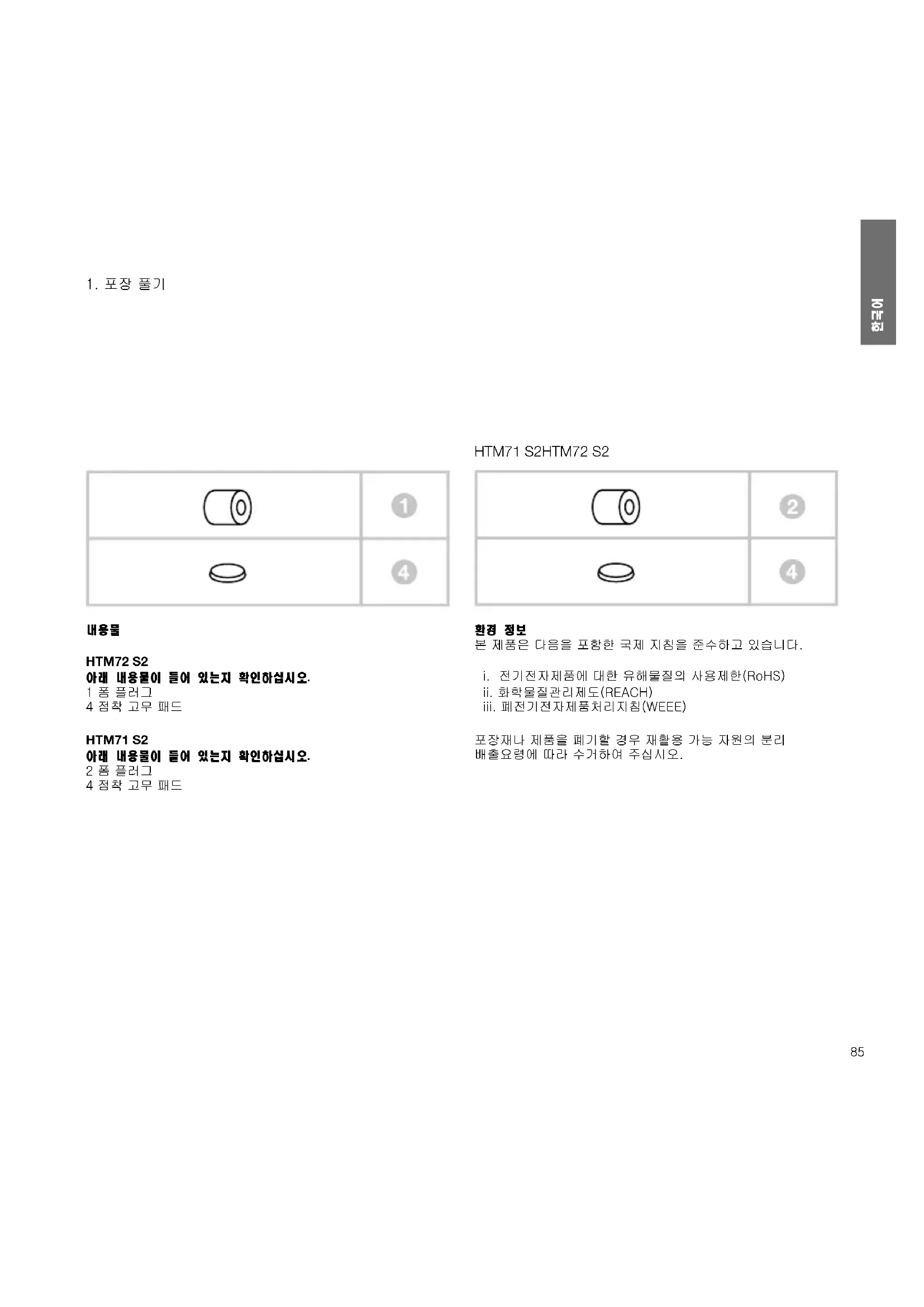 HTM72S2 아래 내용물이 들어 있는지 확인하십시오. 1 폼 플러그 4 점착 고무 패드 HTM71S2 아래 내용물이 들어 있는지 확인하십시오. 2 폼 플러그 4 점착 고무 패드
