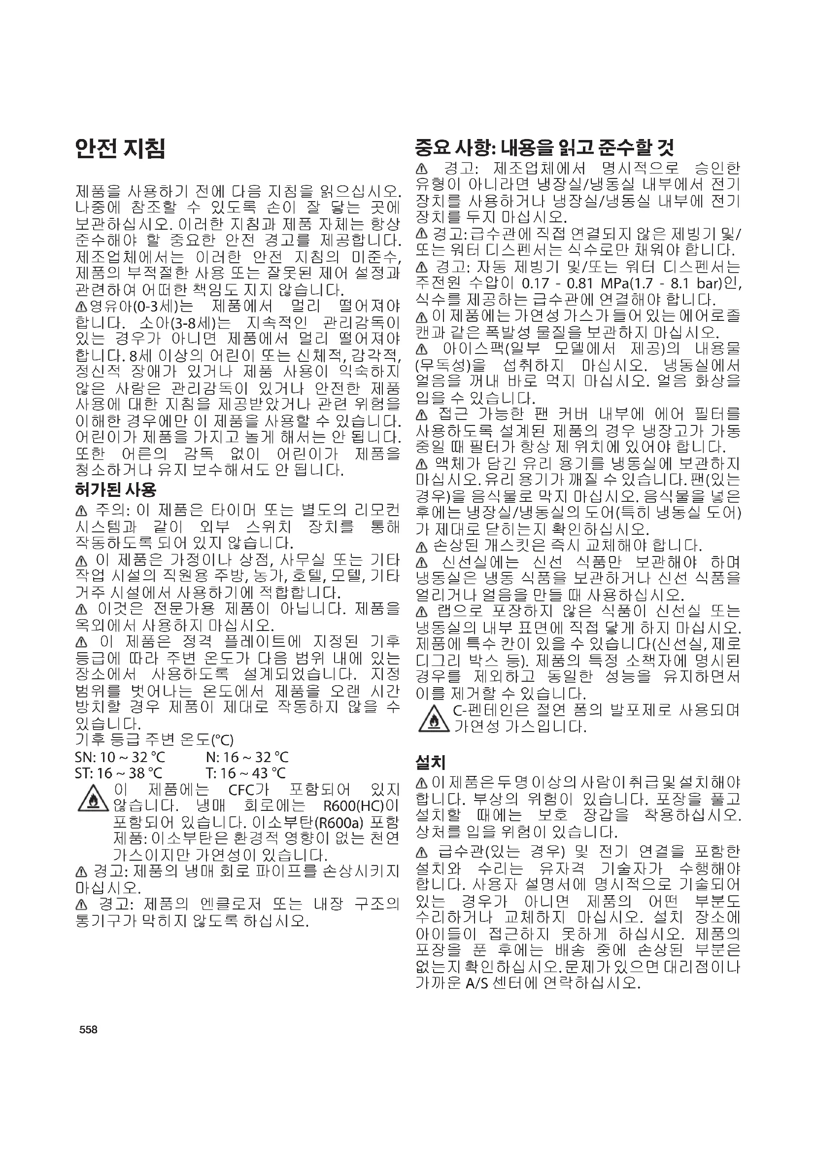 이 제품은 두 명 이상의 사람이 취급 및 설치해야 합니다. 부상의 위험이 있습니다. 포장을 풀고 설치할 때에는 보호 장갑을 착용하십시오. 상처를 입을 위험이 있습니다. 급수관(있는 경우) 및 전기 연결을 포함한 설치와 수리는 유자격 기술자가 수행해야 합니다. 사용자 설명서에 명시적으로 기술되어 있는 경우가 아니면 제품의 어떤 부분도 수리하거나 교체하지 마십시오. 설치 장소에 아이들이 접근하지 못하게 하십시오. 제품의 포장을 푼 후에는 배송 중에 손상된 부분은 없는지 확인하십시오. 문제가 있으면 대리점이나 가까운 A/S 센터에 연락하십시오.559 설치했으면 포장재(플라스틱, 스티로폼 등)를 아이들의 손이 닿지 않는 곳에 보관하십시오. 질식의 위험이 있습니다. 설치 작업을 시작하기 전에 제품을 전원공급장치로부터 분리해야 합니다. 감전의 위험이 있습니다. 제품 설치 중 전원 케이블이 손상되지 않도록 하십시오. 화재 또는 감전의 위험이 있습니다. 설치가 완료된 이후에만 제품에 전원을 연결하십시오. 제품을 옮길 때 바닥(예: 나무 소재의 마루) 이 손상되지 않도록 주의하십시오. 제품 무게를 충분히 견딜 수 있는 바닥 또는 지반이 있고 크기와 용도에 맞는 장소에 설치하십시오. 제품 주변에 열원이 없고, 4개의 다리가 안정적으로 바닥에 놓여 있는지 확인하십시오(필요한 경우 조절할 것). 또한 수준기를 사용하여 제품이 완전히 수평 상태인지 확인하십시오. 냉매 회로의 효율성이 극대화되도록 최소 2시간 후에
