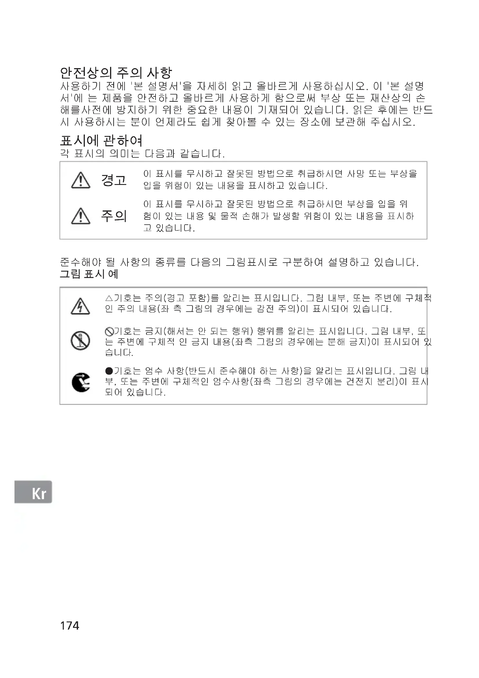 이 표시를 무시하고 잘못된 방법으로 취급하시면 사망 또는 부상을 입을 위험이 있는 내용을 표시하고 있습니다. 이 표시를 무시하고 잘못된 방법으로 취급하시면 부상을 입을 위험이 있는 내용 및 물적 손해가 발생할 위험이 있는 내용을 표시하고 있습니다. 준수해야 될 사항의 종류를 다음의 그림표시로 구분하여 설명하고 있습니다.