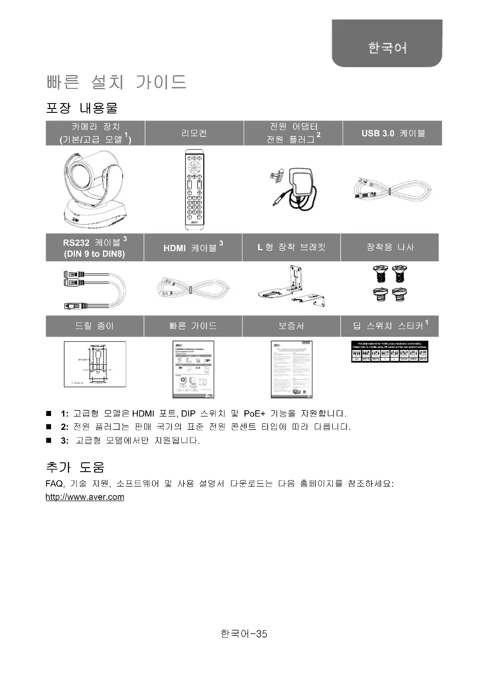 FAQ, 기술 지원, 소프트웨어 및 사용 설명서 다운로드는 다음 홈페이지를 참조하세요: http://www.aver.com 한국어-36