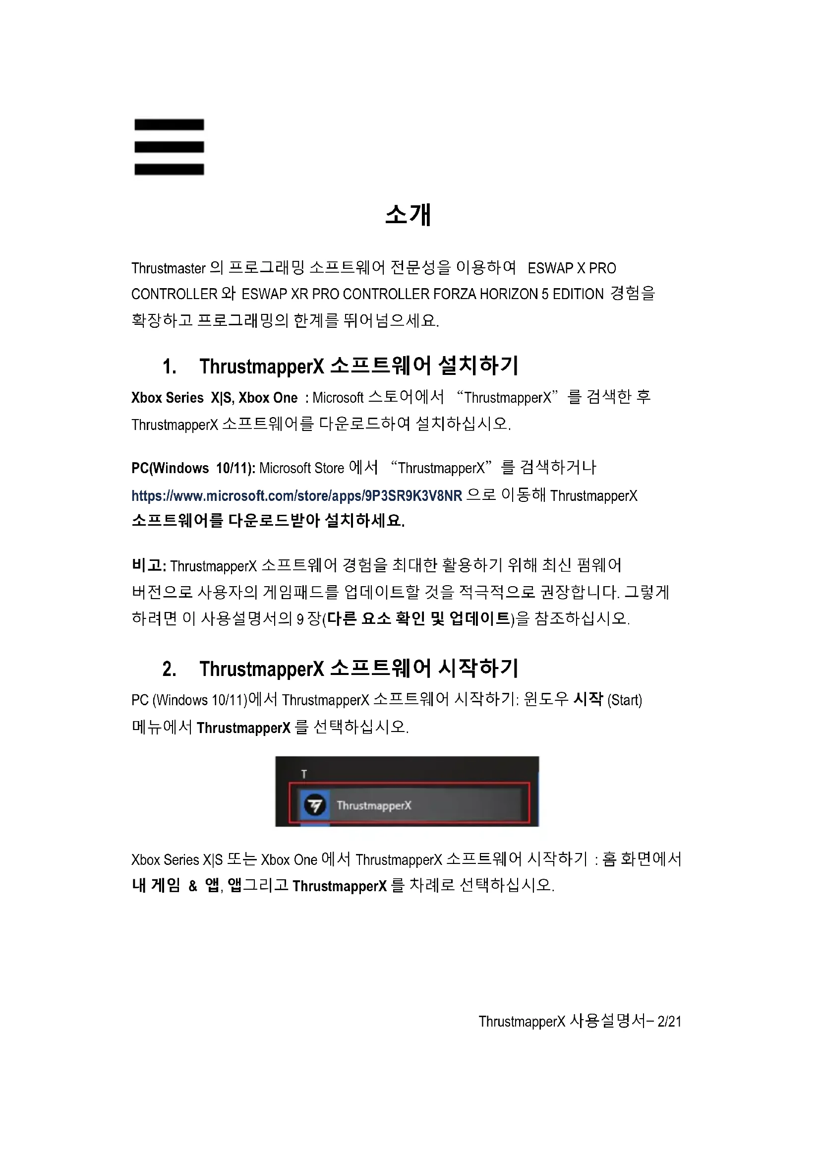 필요하다면 지침을 따라 업데이트를 진행합니다. 비고: ThrustmapperX 소프트웨어 경험을 최대한으로 활용하기 위해 게임패드를 최신 펌웨어 버전으로 업데이트할 것을 강력히 권장합니다.ThrustmapperX 사용설명서— 21/21 COPYRIGHT © 2023 Guillemot Corporation S.A. 모든 권리 보유. Thrustmaster®는 Guillemot Corporation S.A.의 등록 상표입니다. Microsoft, Xbox, Xbox “Sphere” Design, Xbox Series X|S, Xbox One 및 Windows 10/11 는 Microsoft 그룹의 등록 상표입니다. 다른 모든 상표는 해당 소유자의 자산입니다. 도면은 법적 구속력이 없습니다. 설명서의 내용, 설계 및 사양은 예고 없이 변경될 수 있으며, 국가마다 다르게 적용될 수 있습니다. 제조국: 중국 본 설명서의 내용은 Guillemot Corporation S.A.의 명시적 서면 동의가 없는 경우, 복사, 녹음 또는 기타 방식을 통한 전자적, 기계적, 자기적, 수동적 형태나 수단을 막론하고 , 복제, 요약, 전송, 기록하거나 검색 시스템에 저장하거나 특정 언어 또는 컴퓨터 언어로 번역될 수 없습니다. THRUSTMAPPERX 소프트웨어에 적용되는 최종 사용자 라이선스 계약 THRUSTMAPPERX 소프트웨어를 설치하는 동안 나타나는 라이선스 계약을 주의 깊게 읽어보십시오.