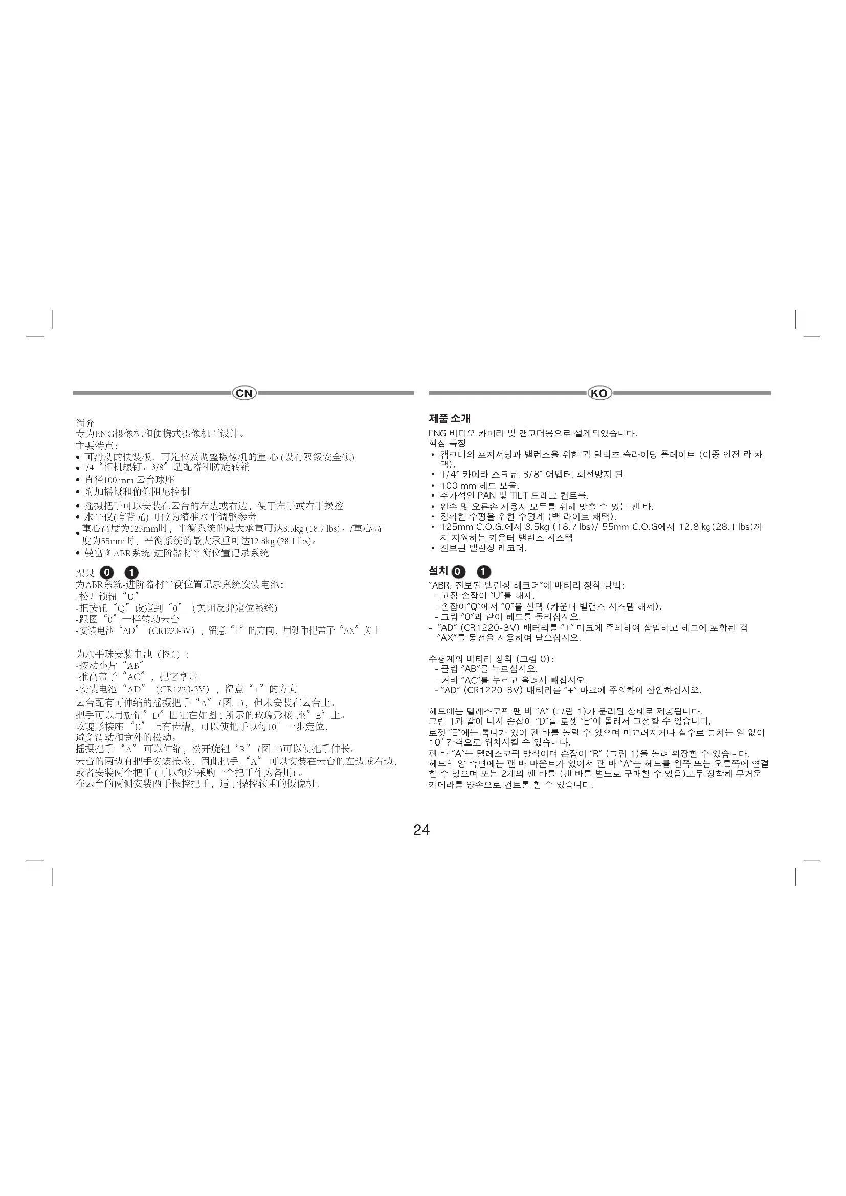 - 1/4" 카메라 스크류, 3/8" 어댑터, 회전방지 핀• 100 mm 헤드 보울.• 추가적인 PAN 및 TILT 드래그 컨트롤.• 왼손 및 오른손 사용자 모두를 위해 맞출 수 있는 팬 바.• 정확한 수평을 위한 수평계 (백 라이트 채택).• 125mm C.O.G.에서 8.5kg (18.7 lbs)/ 55mm C.O.G에서 12.8 kg(28.1 lbs)까지 지원하는 카운터 밸런스 시스템• 진보된 밸런싱 레코더. "ABR. 진보된 밸런싱 레코더"에 배터리 장착 방법: - 고정 손잡이 "U"를 해제. - 손잡이"Q"에서 "0"을 선택 (카운터 밸런스 시스템 해제). - 그림 "0"과 같이 헤드를 돌리십시오. - "AD" (CR1220-3V) 배터리를 "+" 마크에 주의하여 삽입하고 헤드에 포함된 캡 "AX"를 동전을 사용하여 닫으십시오.수평계의 배터리 장착 (그림 0): - 클립 "AB"를 누르십시오. - 커버 "AC"를 누르고 올려서 빼십시오. - "AD" (CR1220-3V) 배터리를 "+" 마크에 주의하여 삽입하십시오.헤드에는 텔레스코픽 팬 바 "A" (그림 1)가 분리된 상태로 제공됩니다.그림 1과 같이 나사 손잡이 "D"를 로젯 "E"에 돌려서 고정할 수 있습니다.로젯 "E"에는 톱니가 있어 팬 바를 돌릴 수 있으며 미끄러지거나 실수로 놓치는 일 없이 10˚ 간격으로 위치시킬 수 있습니다.팬 바 "A"는 텔레스코픽 방식이며 손잡이 "R" (그림 1)을 돌려 확장할 수 있습니다. 헤드의 양 측면에는 팬 바 마운트가 있어서 팬 바 "A"는 헤드를 왼쪽 또는 오른쪽에 연결할 수 있으며 또는 2개의 팬 바를 (팬 바를 별도로 구매할 수 있음)모두 장착해 무거운 카메라를 양손으로 컨트롤 할 수 있습니다.