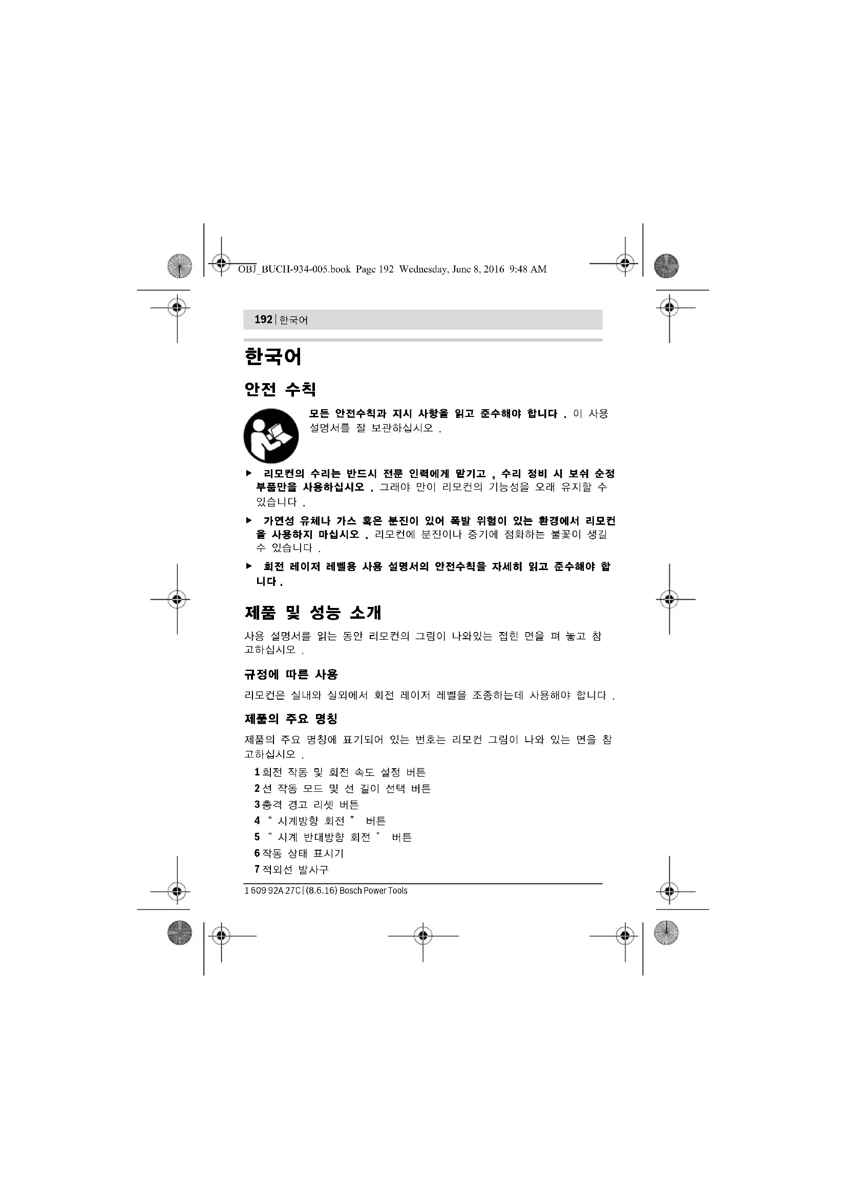 리모컨과 배터리 / 충전용 배터리를 가정용 쓰레기로 처리하지 마십시오 ! EU 국가만 해당 : 더이상 사용할 수 없는 전동 기기 및 결함이 있거나 사용한 충전용 배터리 / 배터리는 유럽 가이드라인 2012/19/EU 및 유럽 가이드라인 2006/66/EG 에 따라 분리 수거하여 환경 규정에 맞춰 재활용해야 합니다 . 위 사항은 사전 예고 없이 변경될 수 있습니다 . OBJ_BUCH-934-005.book Page 197 Wednesday, June 8, 2016 9:48 AM198 | 1 609 92A 27C | (8.6.16) Bosch Power Tools
