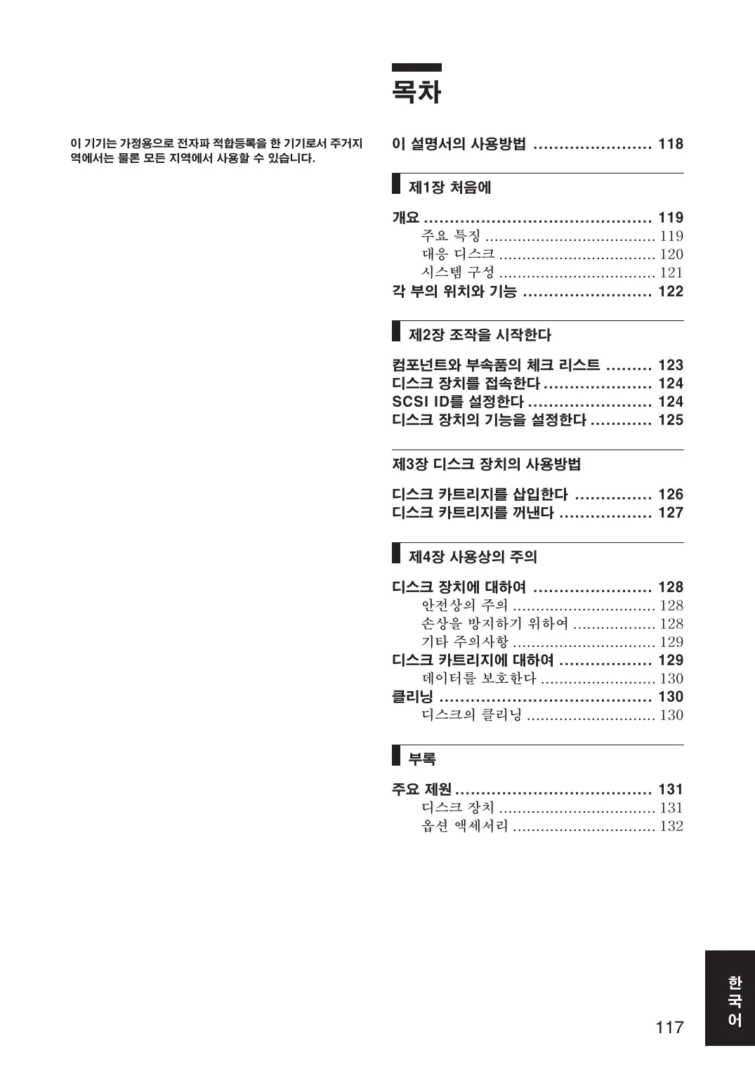 이 기기는 가정용으로 전자파 적합등록을 한 기기로서 주거지 역에서는 물론 모든 지역에서 사용할 수 있습니다. 이 설명서의 사용방법 ....................... 118 제1장 처음에 개요 ............................................ 119 주요 특징 ..................................... 119 대응 디스크 .................................. 120 시스템 구성 .................................. 121 각 부의 위치와 기능 ......................... 122 제2장 조작을 시작한다 컴포넌트와 부속품의 체크 리스트 ......... 디스크 장치를 접속한다 ..................... SCSI ID를 설정한다 ........................ 디스크 장치의 기능을 설정한다 ............