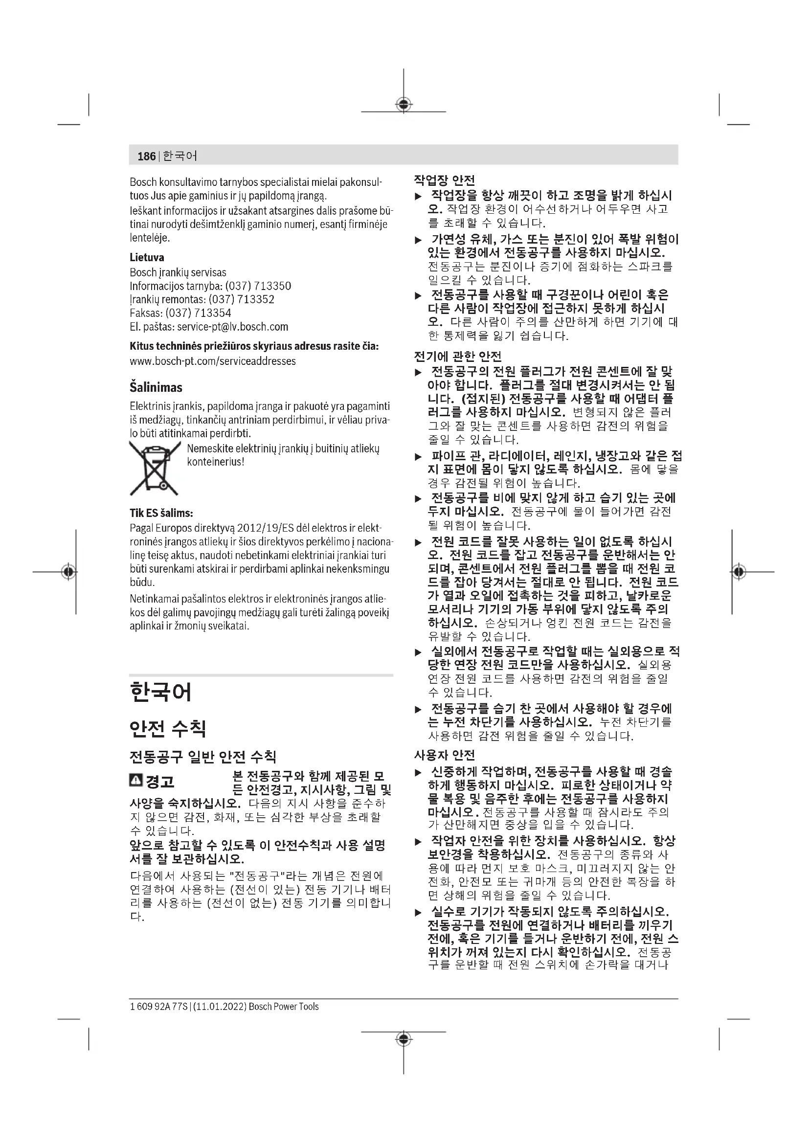 오직 EU 국가에만 해당: 전기장치 및 전자장치 노후기기에 관한 유럽 가이드 라인 2012/19/EU 및 국가별 해당 법에 따라 더 이 상 사용 불가능한 진공청소기는 별도로 수거하여 환 경보호 규정에 따라 재활용해야 합니다. 규정에 맞춰 폐기하지 않을 경우 전기장치 및 전자 장치 노후기기에 남아 있을 수 있는 위험 물질로 인 해 환경 및 인체에 유해한 영향을 미칠 수 있습니다. Bosch Power Tools 1 609 92A 77S | (11.01.2022)192 | يبرع
