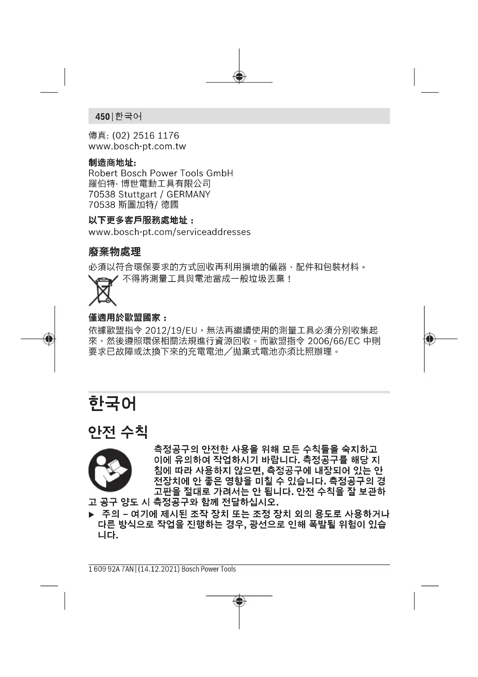 1 609 92A 7AN | (14.12.2021) Bosch Power Toolsไทย | 463 측정공구 및 배터리를 가정용 쓰레기에 버리지 마십시오! 오직 EU 국가에만 해당: 더이상 사용할 수 없는 측정공구 및 결함이 있거나 사용한 충전용 배터리/ 배터리는 유럽 가이드라인 2012/19/EU 및 유럽 가이드라인 2006/66/EC 에 따라 분리 수거하여 환경 규정에 맞춰 재활용해야 합니다.