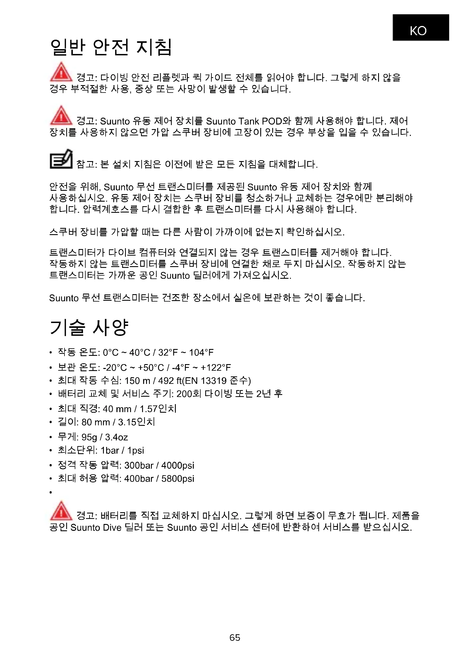 경고: 배터리를 직접 교체하지 마십시오. 그렇게 하면 보증이 무효가 됩니다. 제품을 공인 Suunto Dive 딜러 또는 Suunto 공인 서비스 센터에 반환하여 서비스를 받으십시오. KO66