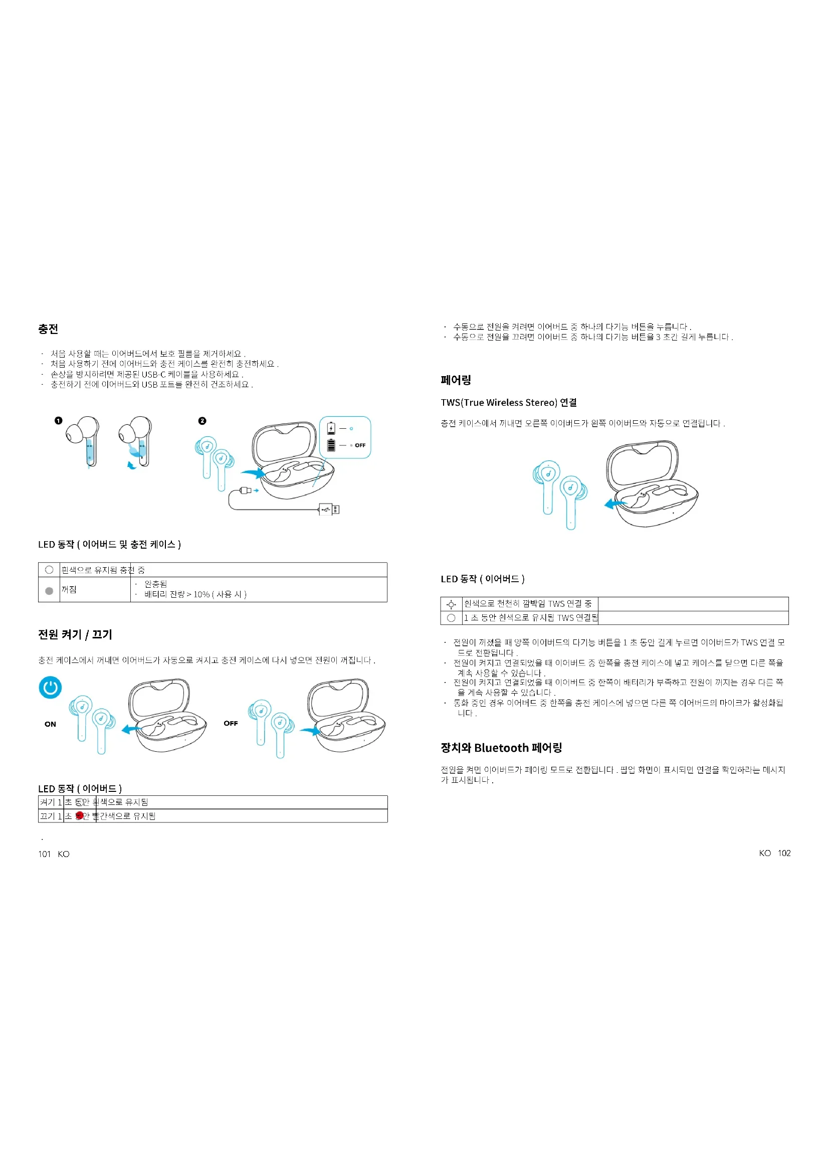 전원을 켜면 이어버드가 페어링 모드로 전환됩니다 .팝업 화면이 표시되면 연결을 확인하라는 메시지 가 표시됩니다 .103 KO KO 104 Soundcore Life P2 Bluetooth Pairing Request “Headset” would like to pair with your iPhone Cancel Pair Pair LED 동작 ( 이어버드 ) 흰색으로 깜박임 Bluetooth페어링 1 초 동안 흰색으로 유지됨 Bluetooth연결됨 페어링 과정에서 일부 장치는QualcommTrueWirelessPrimary-Secondary이중 페어링 이름과 호 환되지 않습니다 ." 페어링 " 을 탭할 때" 연결 실패 " 가 표시될 수 있으며 화면조차 팝업되지 않을 수 있습니다 .사용에 영향을 주지 않으므로 걱정하지 마십시오 . 성공적으로 페어링되면 기본 이어버드는 장치와 연결되고 보조 이어버드로 신호를 전송합니다 .보조 이어버드는 장치와 연결되지 않습니다 .결과적으로 ,장치의Bluetooth페어링 목록에서 한쪽만 연결 되어 있고 다른 쪽은 연결되지 않았음을 나타낼 수 있습니다 .