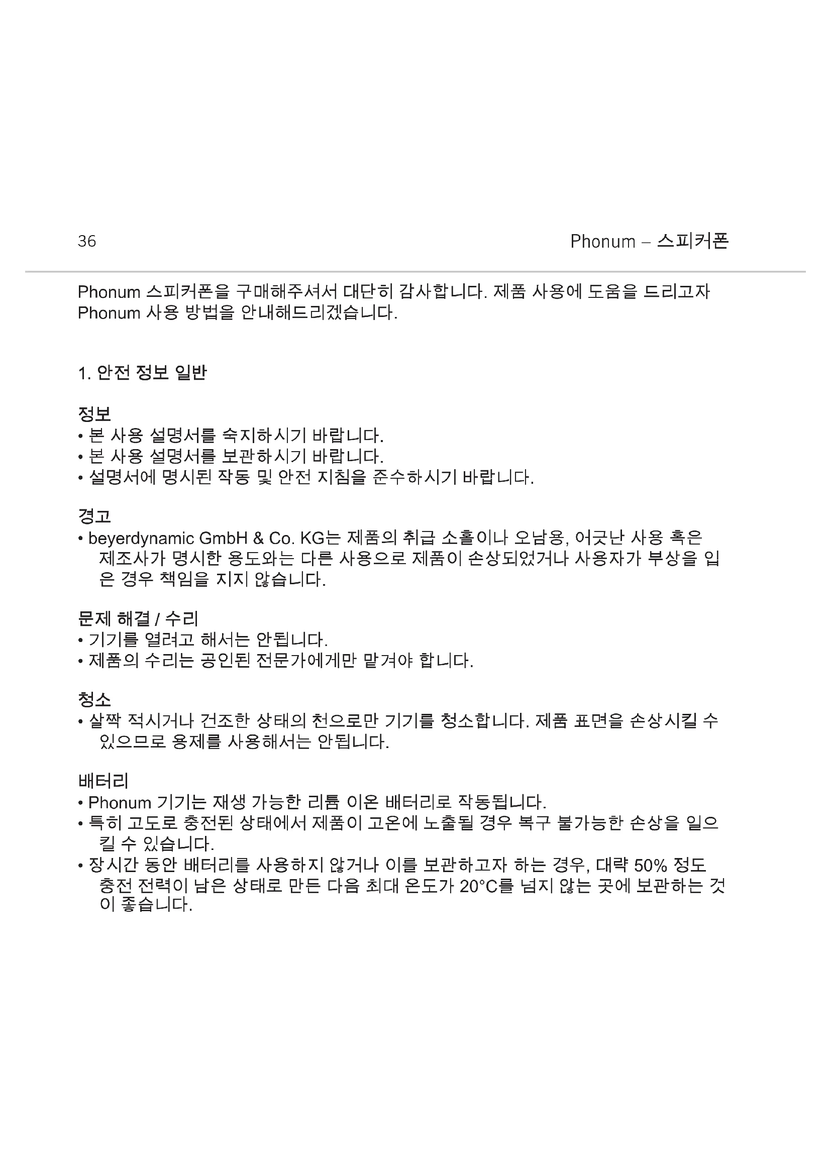 - 차가운 공간에서 사용하다가 다시 따뜻한 곳으로 들여오는 경우, 제품 표면에 물방울 이 맺힐 수 있습니다. 최소 2시간 정도 기다린 후 제품을 작동하시기 바랍니다.Phonum – 스피커폰