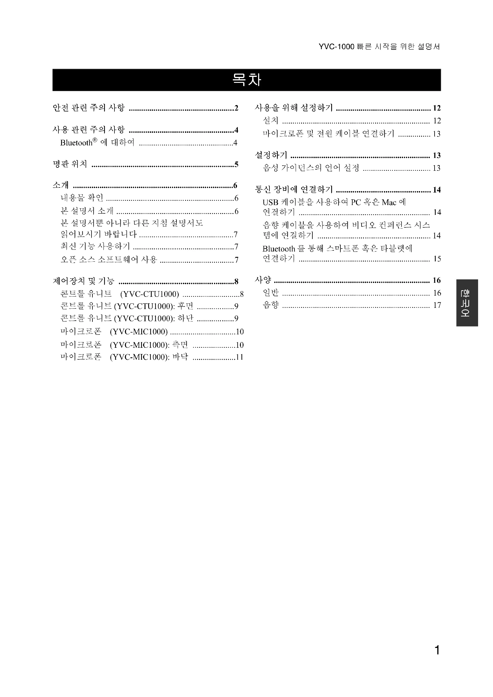 소개YVC-1000 빠른 시작을 위한 설명서