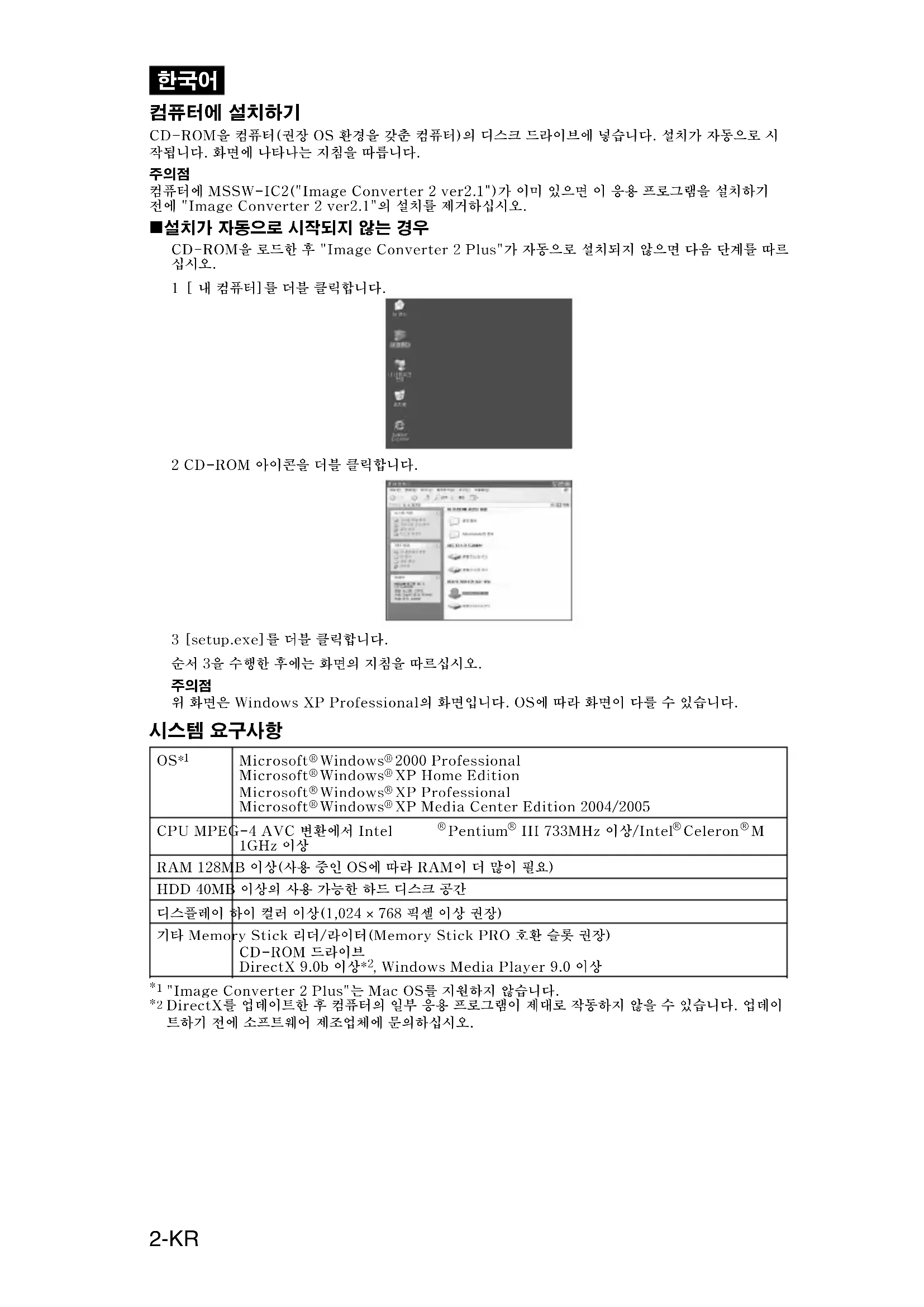 컴퓨터에 MSSW-IC2("Image Converter 2 ver2.1")가 이미 있으면 이 응용 프로그램을 설치하기 전에 "Image Converter 2 ver2.1"의 설치를 제거하십시오. x 설치가 자동으로 시작되지 않는 경우 CD-ROM을 로드한 후 "Image Converter 2 Plus"가 자동으로 설치되지 않으면 다음 단계를 따르