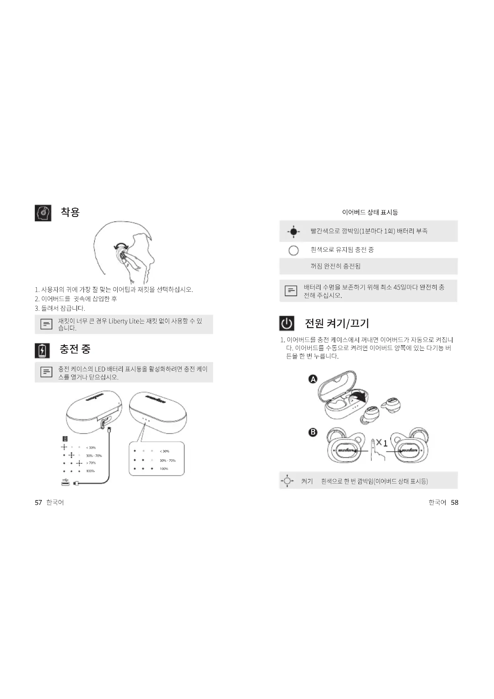 흰색으로 한 번 깜박임(이어버드 상태 표시등)59 한국어