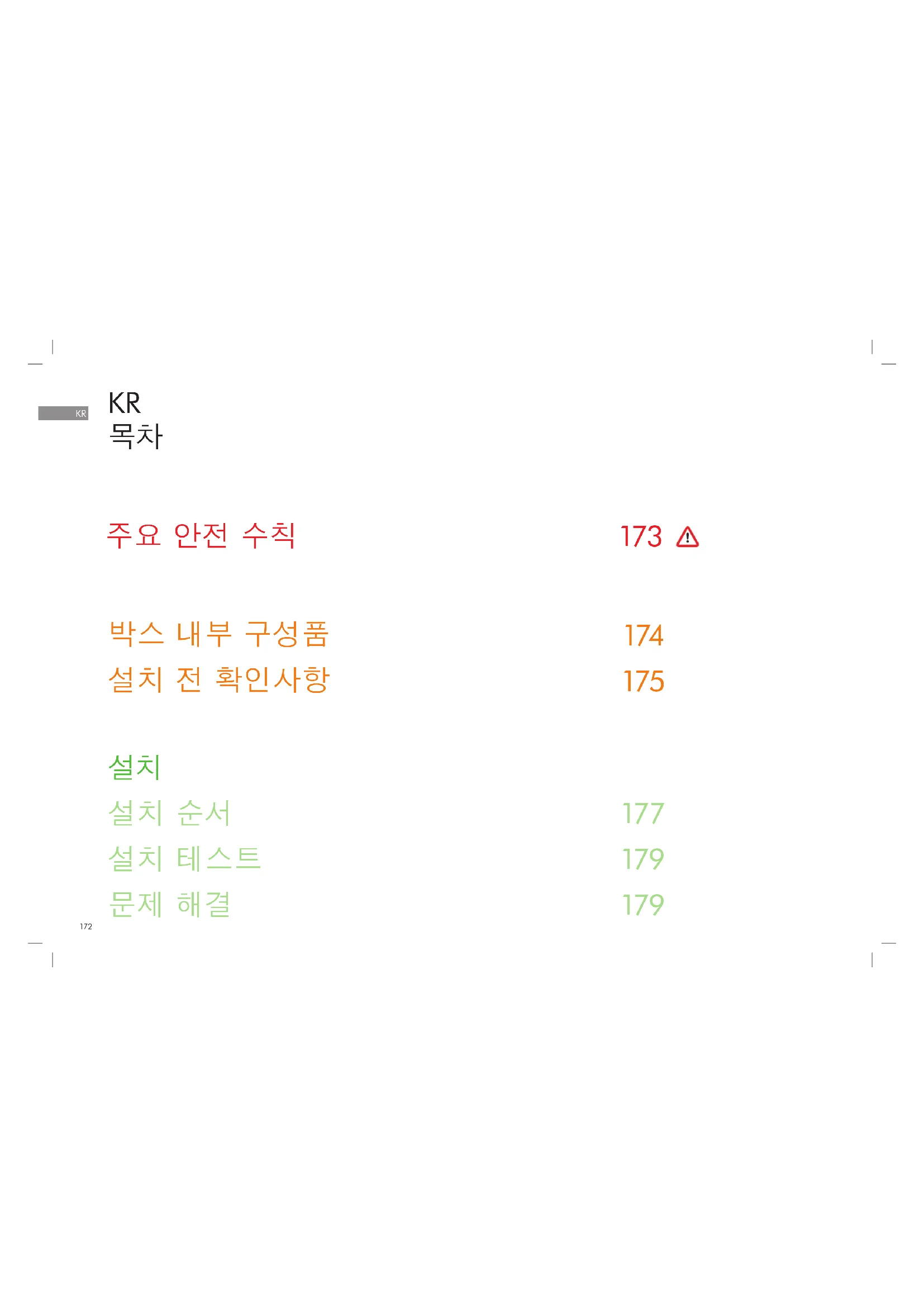 구성품의 포장을 열 때 주의하십시오. 베이거나 상처를 입을 수 있는 날카로운 모서리/면이 있을 수 있습니다. 청소 시 또는 제품 가까이에서 물 분사 장비를 사용하지 마십시오. 주요 안전 수칙KR