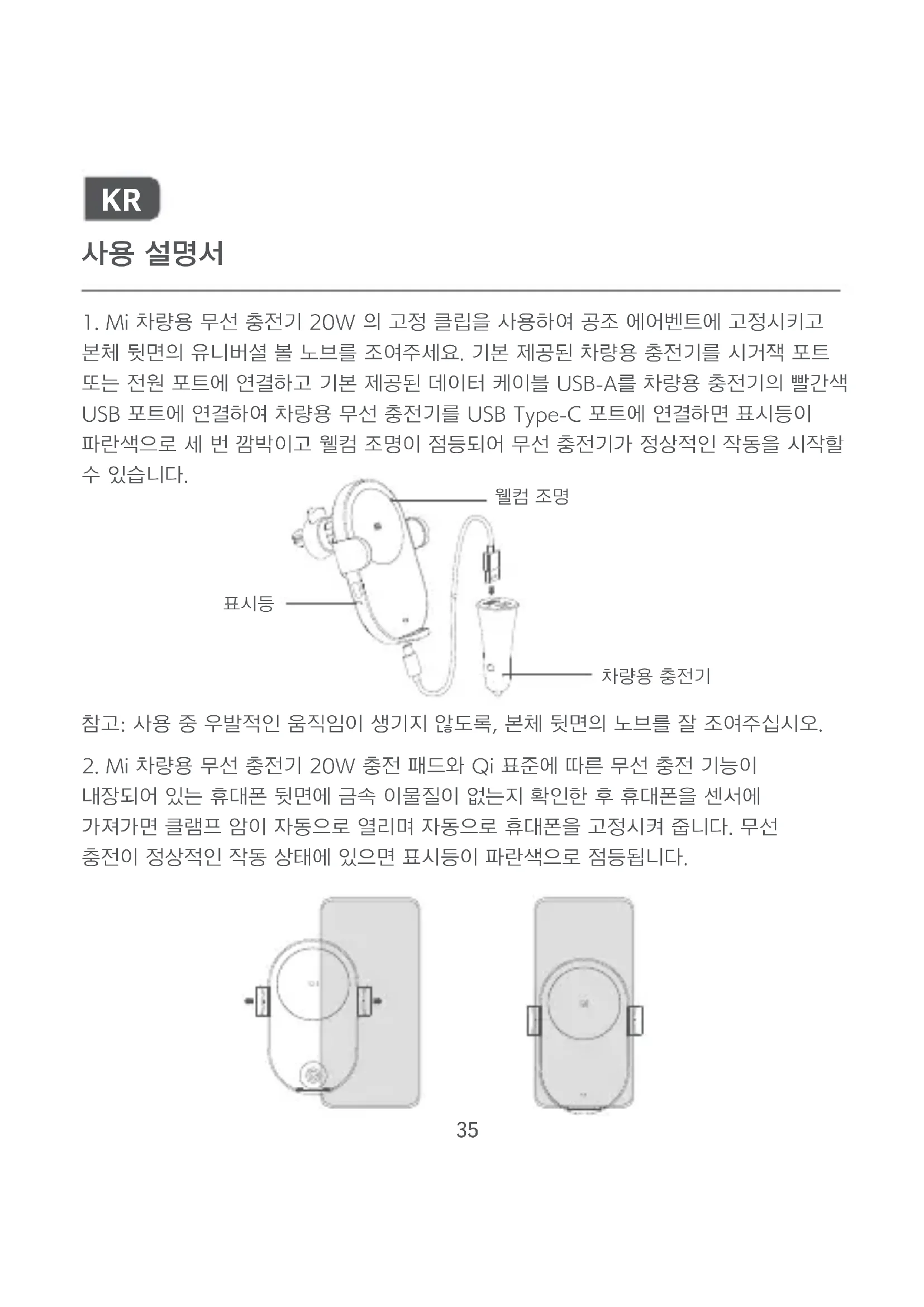 본체 뒷면의 유니버셜 볼 노브를 조여주세요. 기본 제공된 차량용 충전기를 시거잭 포트 또는 전원 포트에 연결하고 기본 제공된 데이터 케이블 USB-A를 차량용 충전기의 빨간색 USB 포트에 연결하여 차량용 무선 충전기를 USB Type-C 포트에 연결하면 표시등이 파란색으로 세 번 깜박이고 웰컴 조명이 점등되어 무선 충전기가 정상적인 작동을 시작할 수 있습니다.36 *무선 충전을 지원하지 않는 휴대폰을 사용하는 경우, 표시등의 깜박임은 정상입니다.