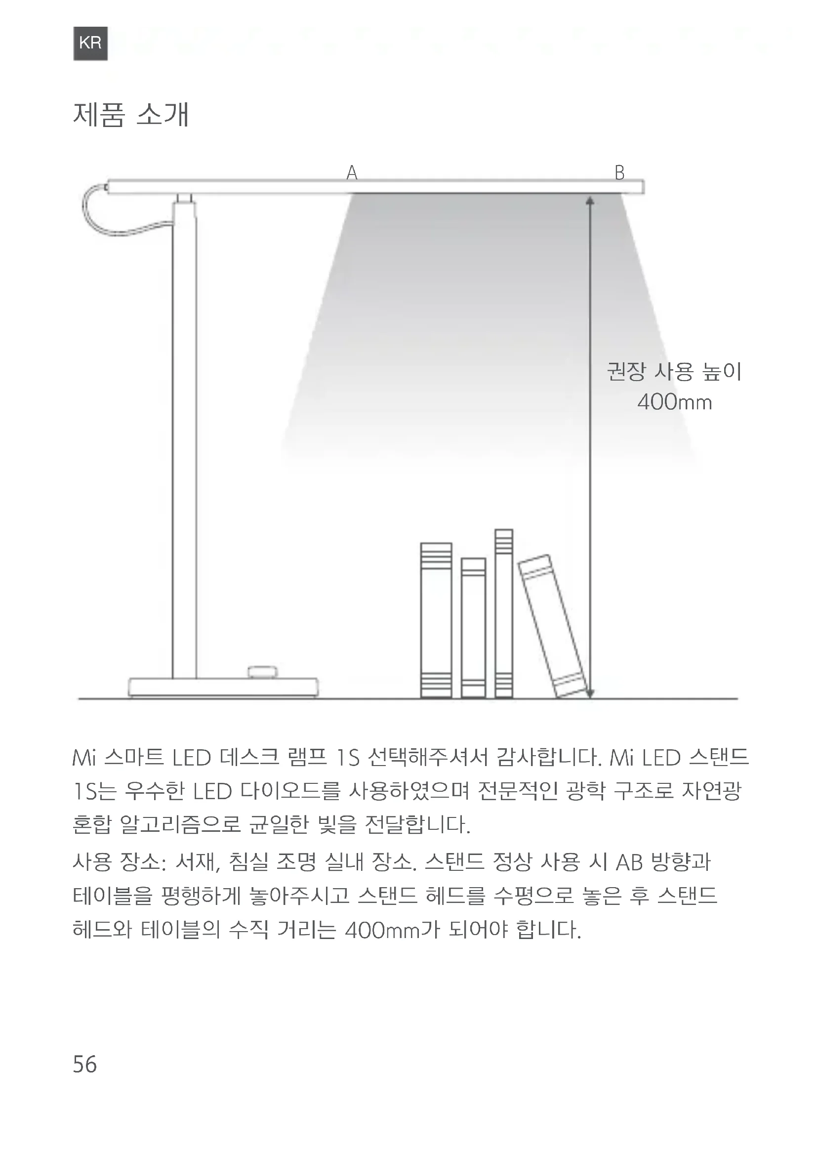 400mm Mi 스마트 LED 데스크 램프 1S 선택해주셔서 감사합니다. Mi LED 스탠드 1S는 우수한 LED 다이오드를 사용하였으며 전문적인 광학 구조로 자연광 혼합 알고리즘으로 균일한 빛을 전달합니다. A B 사용 장소: 서재, 침실 조명 실내 장소. 스탠드 정상 사용 시 AB 방향과 테이블을 평행하게 놓아주시고 스탠드 헤드를 수평으로 놓은 후 스탠드 헤드와 테이블의 수직 거리는 400mm가 되어야 합니다.57