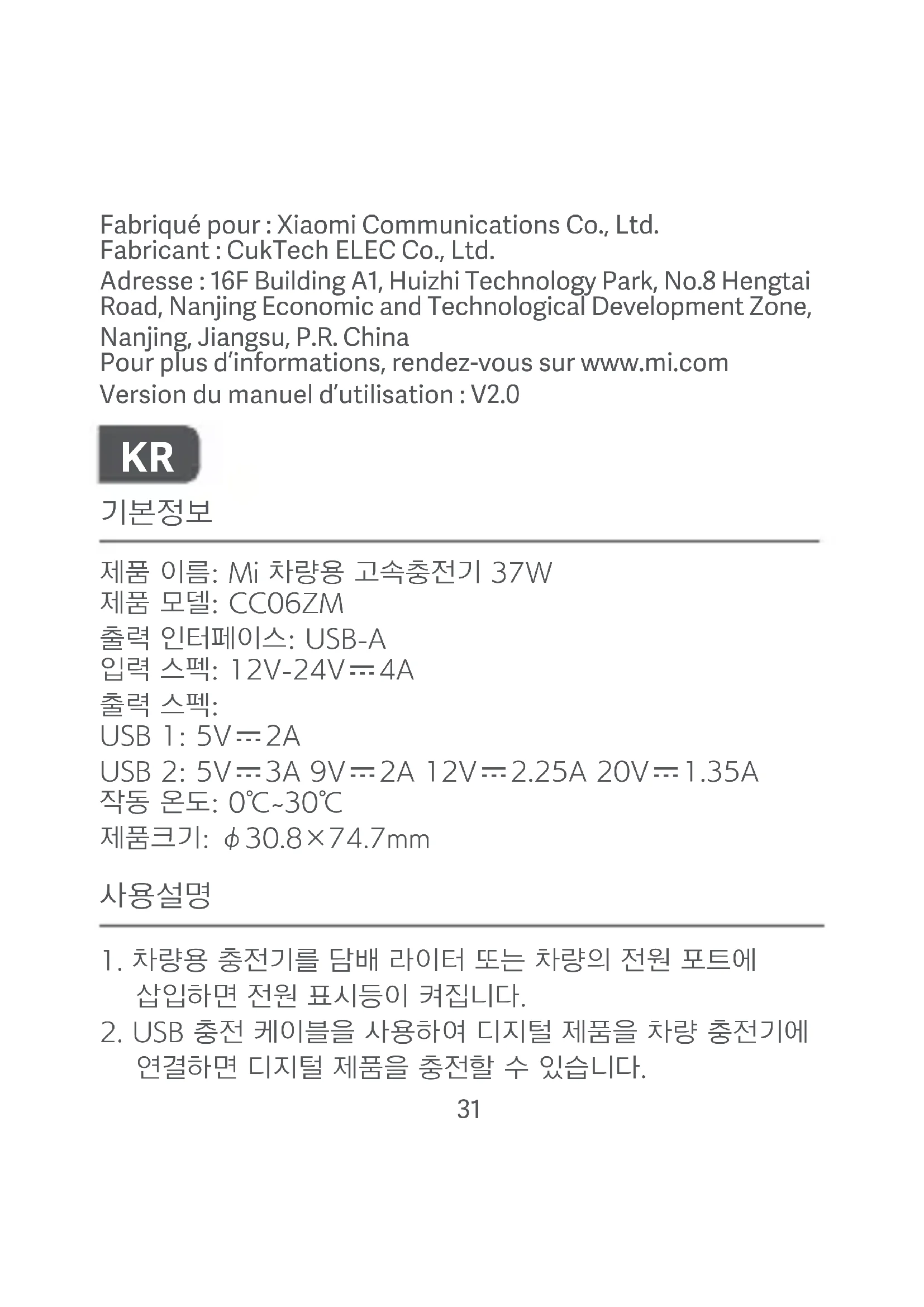 KR경고 이 제품을 함부로 분해, 개봉 또는 찢지 마십시오. 이 제품을 열, 발화원 또는60℃ (140℉) 이상의 온도에 노출시키지 마십시오. 직사광선에 보관하지 마십시오. 이 제품을 단락시키지 마십시오. 이 제품에 기계적 충격을 가하지 마십시오. 이 제품을 사용할 때 어린이는 보호자의 동반이 필요합니다. 차량용 충전기에는 지능형 온도 제어 기능이 있으며 이 기능이 활성화되면 차량용 충전기가 재설정되고 전원이