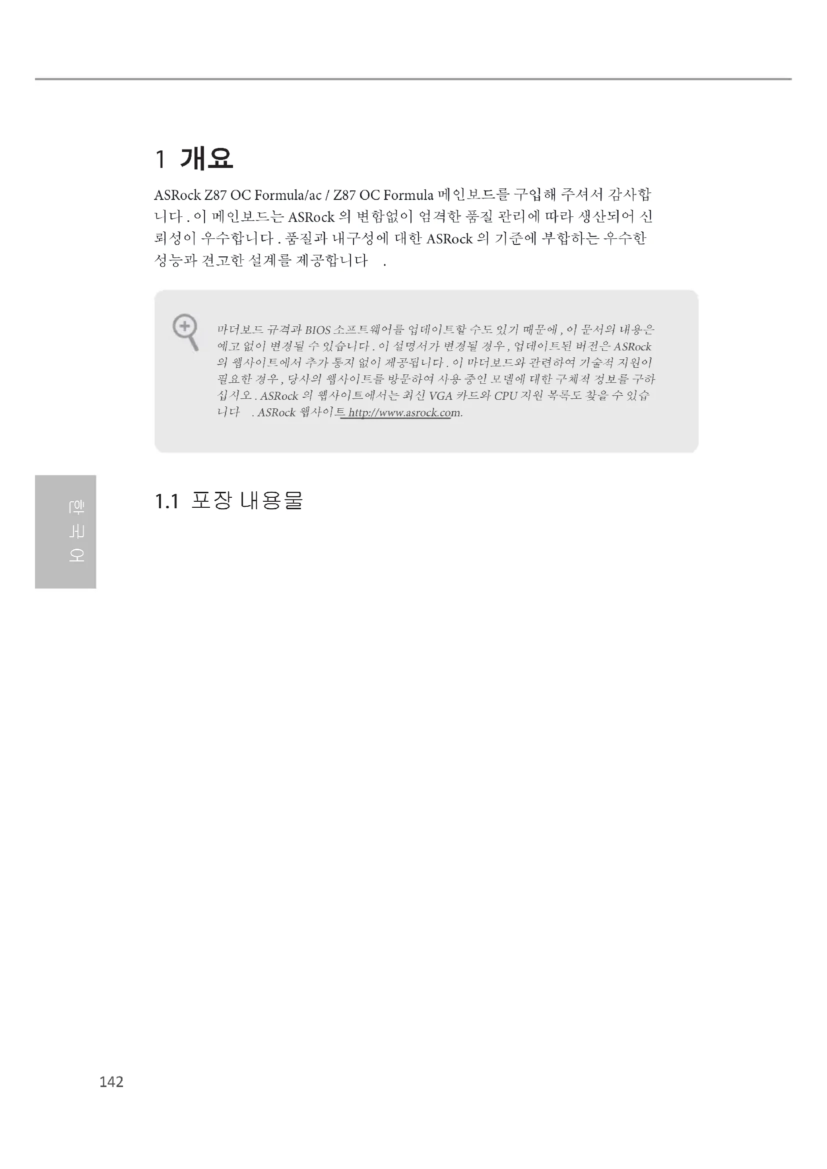 1 개요 ASRock Z87 OC Formula/ac / Z87 OC Formula 메인보드를 구입해 주셔서 감사합 니다 . 이 메인보드는 ASRock 의 변함없이 엄격한 품질 관리에 따라 생산되어 신 뢰성이 우수합니다 . 품질과 내구성에 대한 ASRock 의 기준에 부합하는 우수한 성능과 견고한 설계를 제공합니다 .