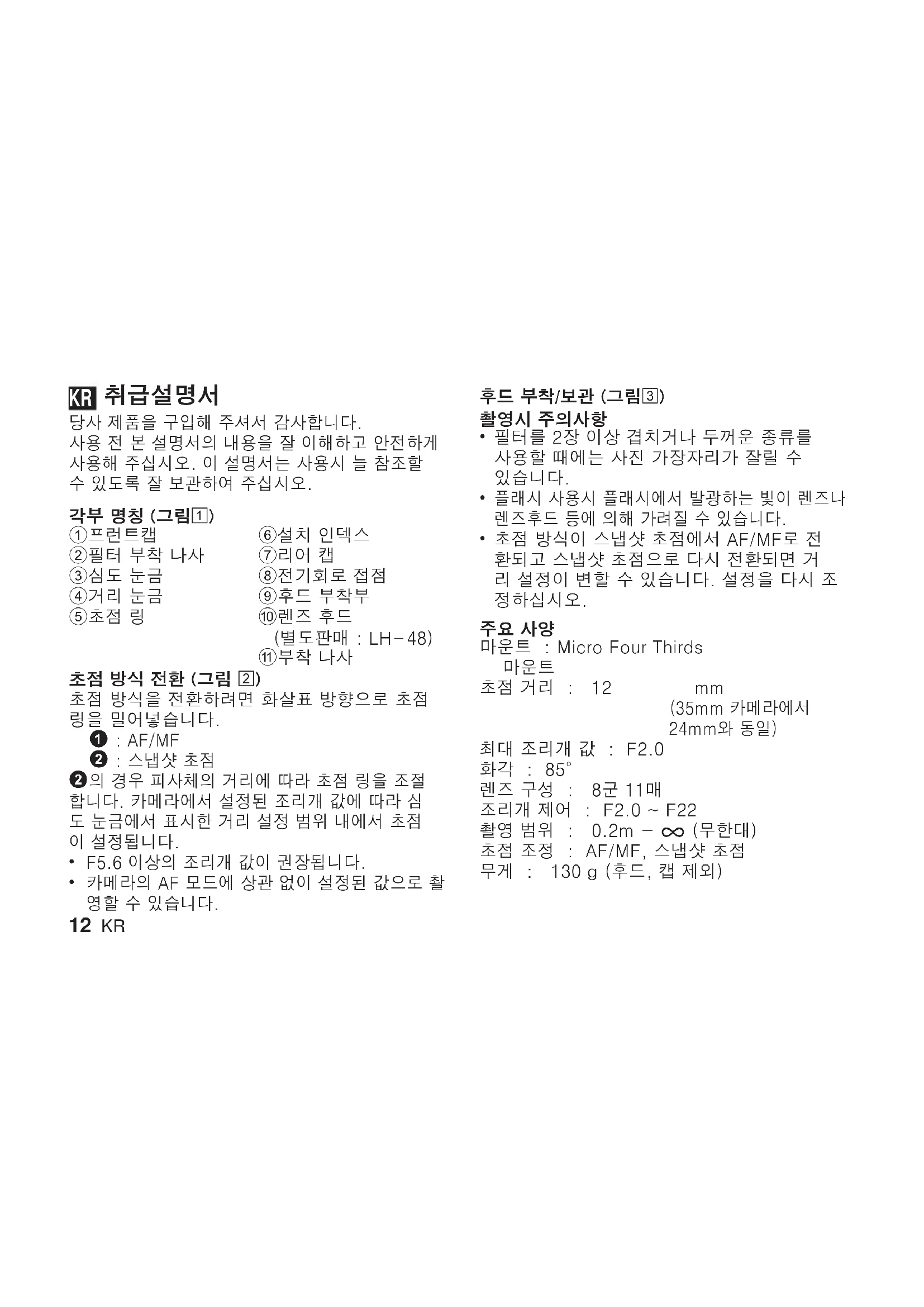 사용 설명서 ED 12mm F2.0 OLYMPUS